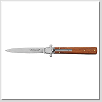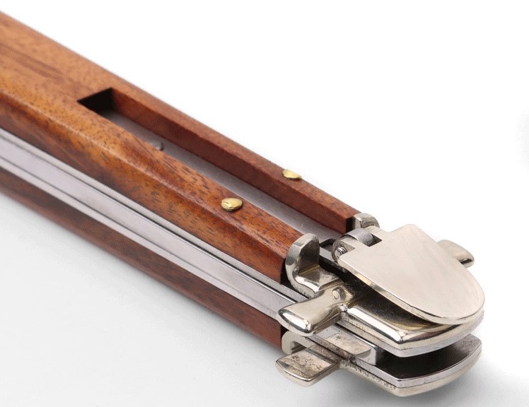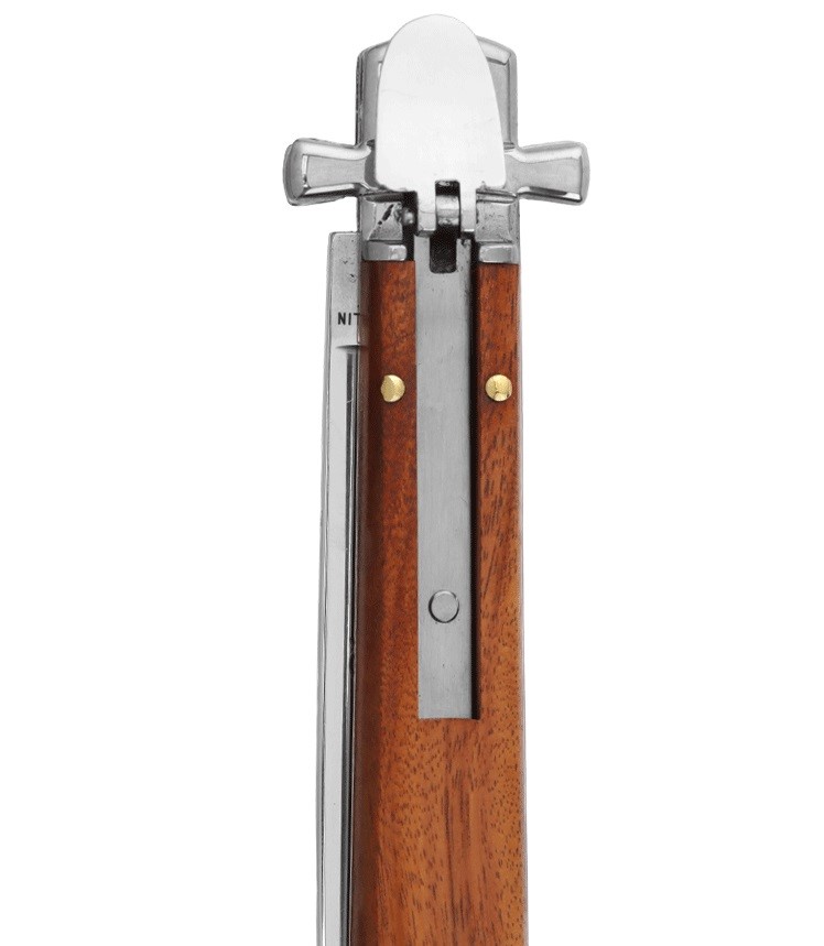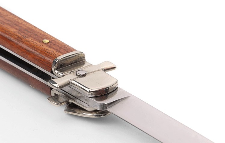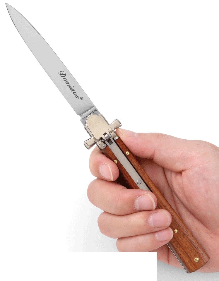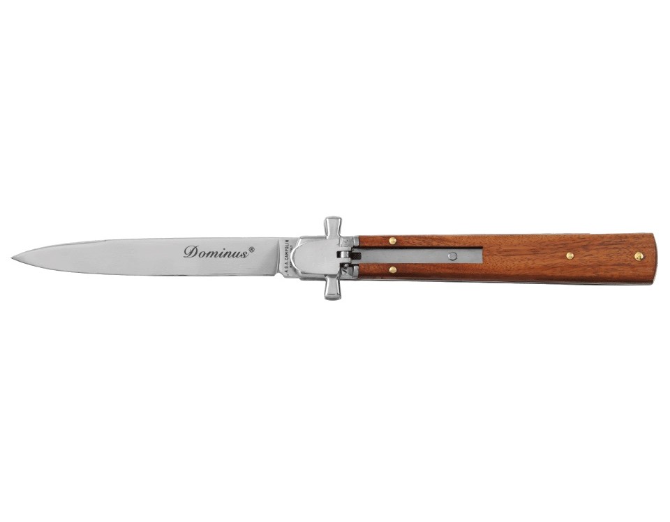 這款自動刀名為“Dominus”,意為“主”。它是義大利馬尼亞戈的AGA Campolin公司全新打造的彈簧刀。刀柄採用鎳銀材質,護手呈馬耳他十字形,並配備用於開合刀刃的槓桿機構,完美融合了傳統工藝與精準工藝。刀身內襯採用440A鋼材,做工精良。產品以紙盒包裝。