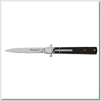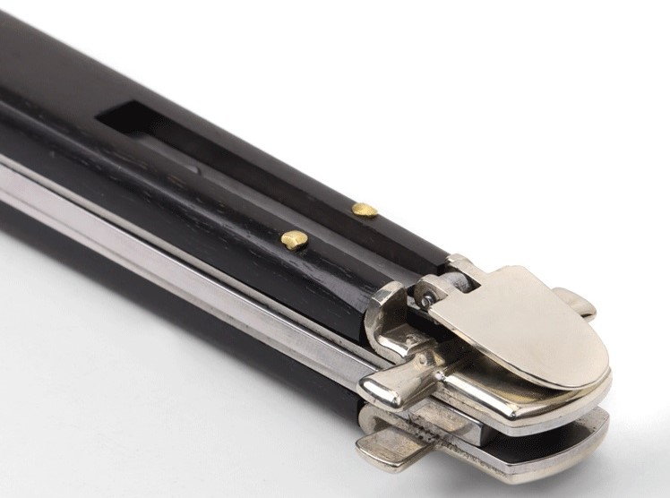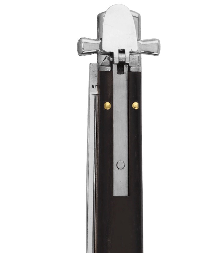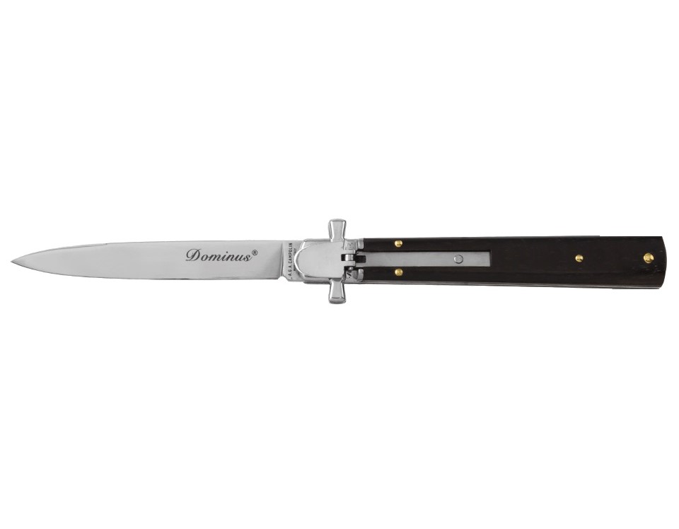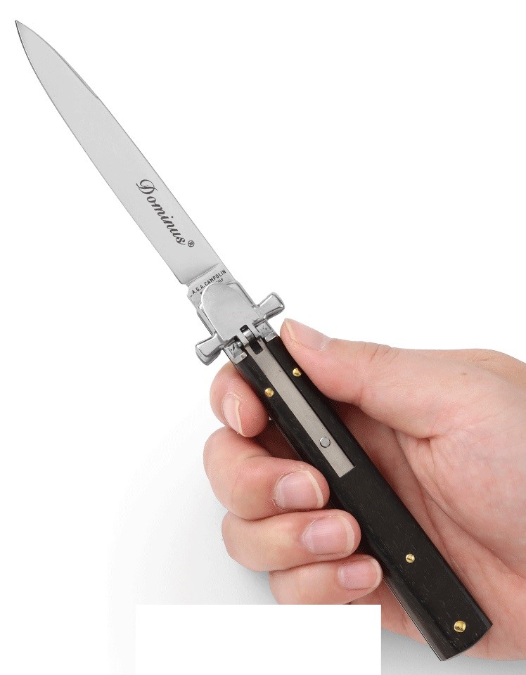 這款自動刀名為“Dominus”,意為“主”。它是義大利馬尼亞戈的AGA Campolin公司全新打造的彈簧刀。刀柄採用鎳銀材質,護手呈馬耳他十字形,並配備用於開合刀刃的槓桿機構,完美融合了傳統工藝與精準工藝。刀身內襯採用440A鋼材,做工精良。產品以紙盒包裝。