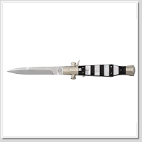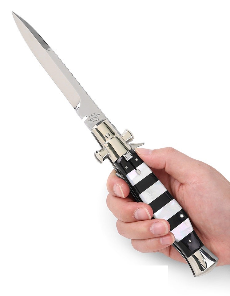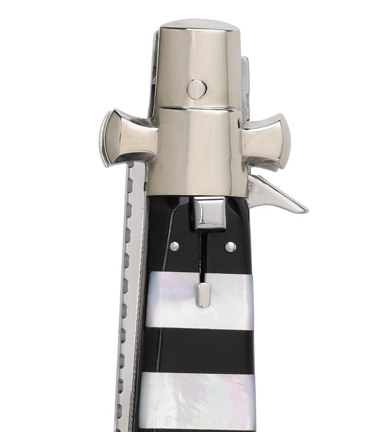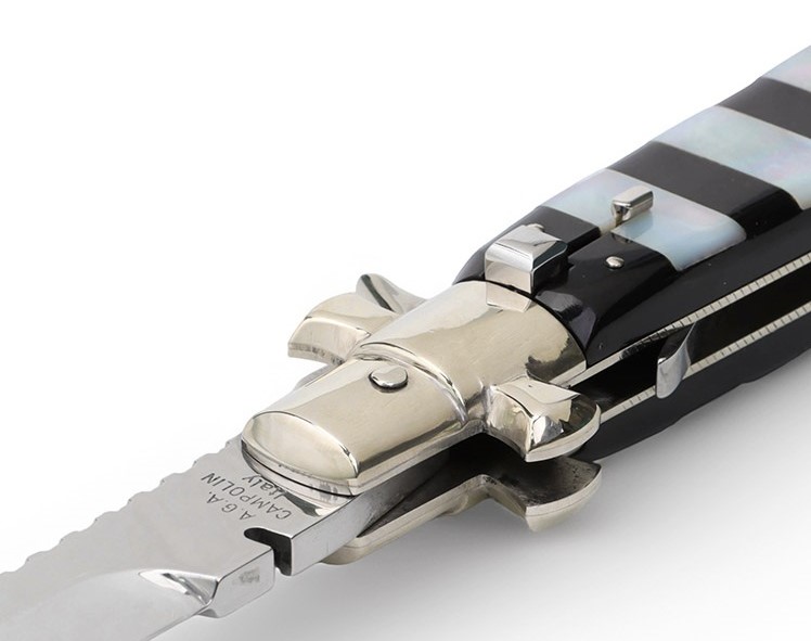 這把手工製作的義大利自動彈簧刀採用馬耳他十字護手設計,配備方形按鈕與安全鎖,並使用 Lever Release(拉桿釋放)機構。