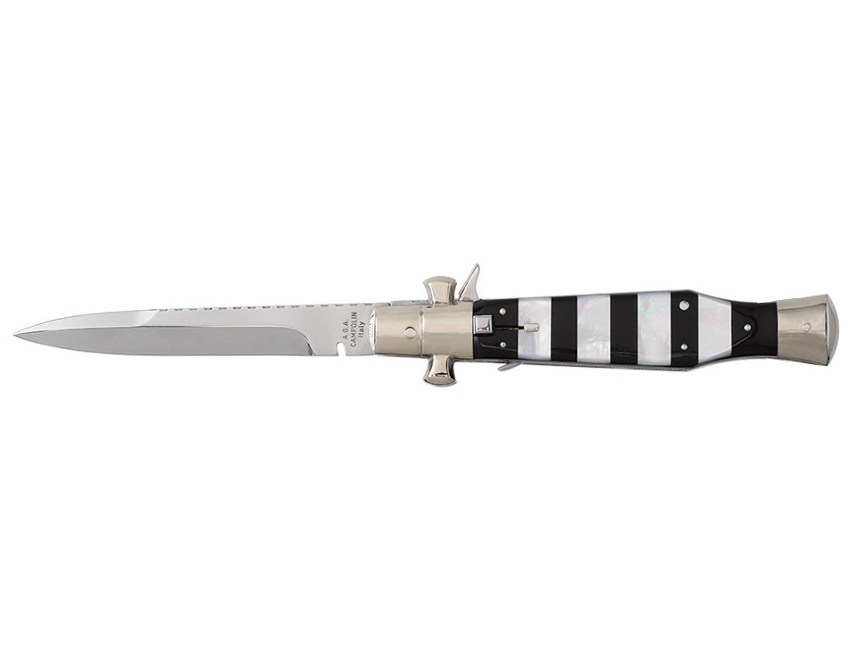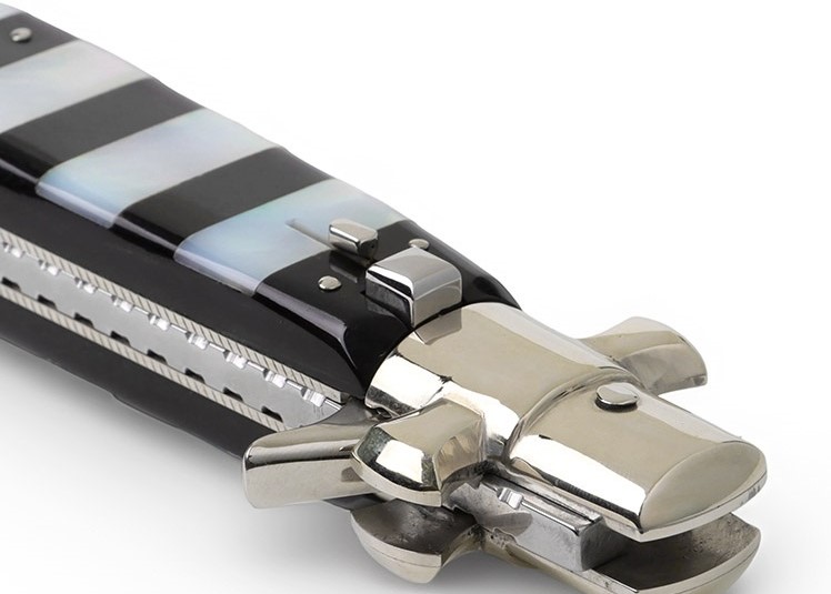 刀上的所有金屬零件皆由鎳銀製成,而刀刃、彈簧與內襯都採用了傳統義大利彈簧刀製作工藝中的手工銼刻裝飾,展現老派 Switchblade 製作的經典技術。