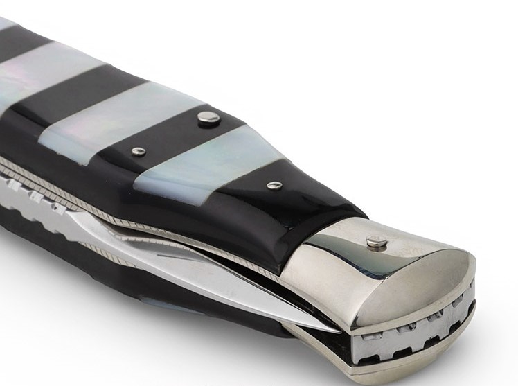 刀柄為 「黃蜂身 Wasp Body」造型的水牛角,並鑲嵌珍珠母裝飾,使整體外觀更加華麗。