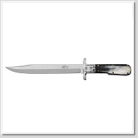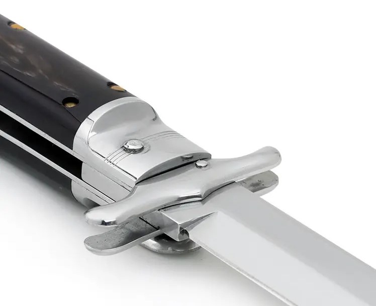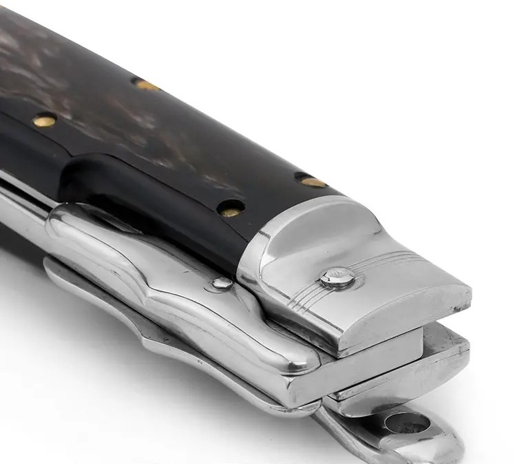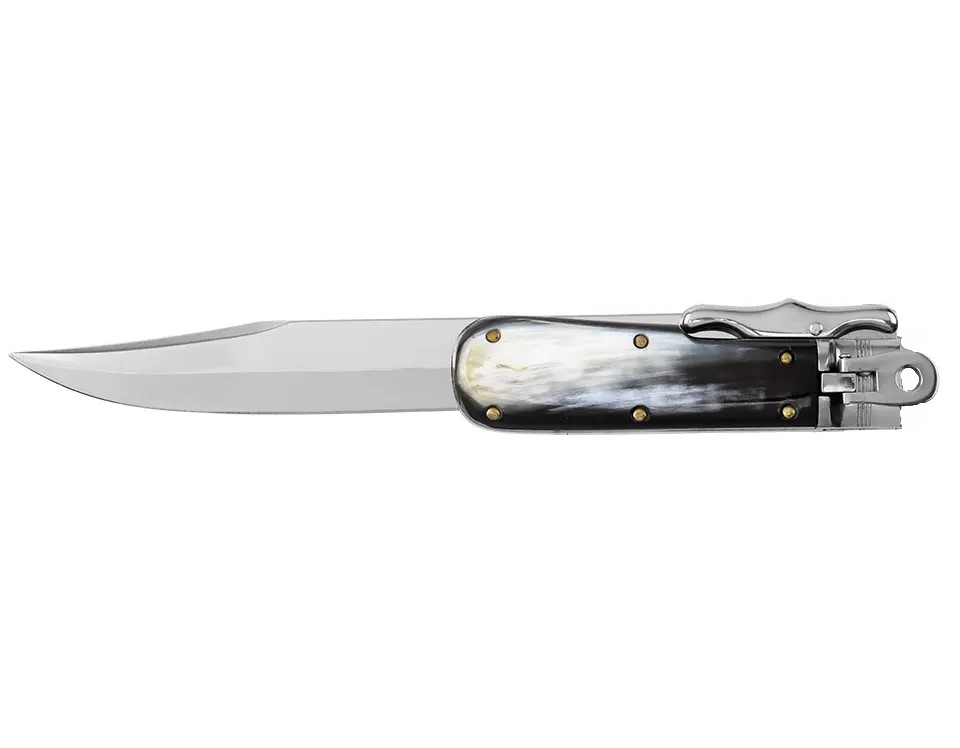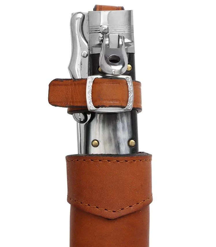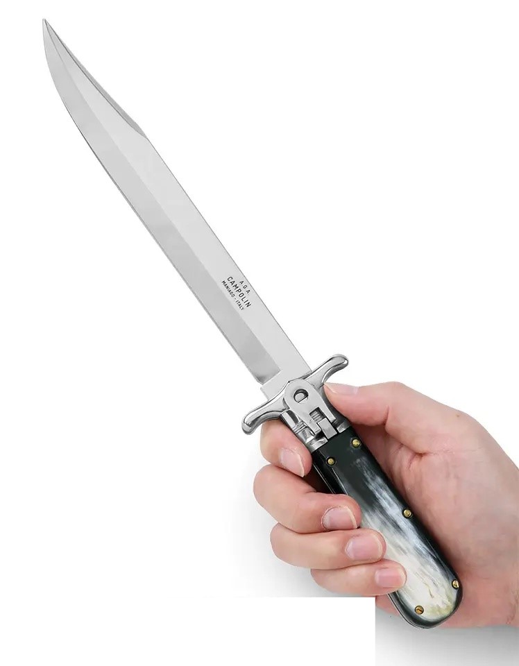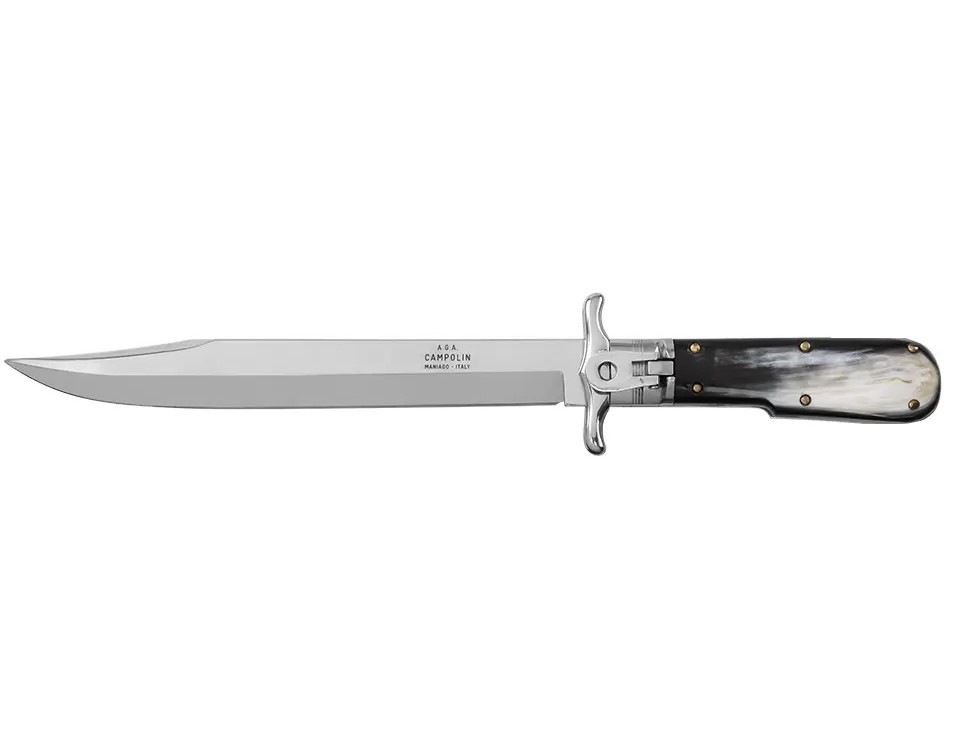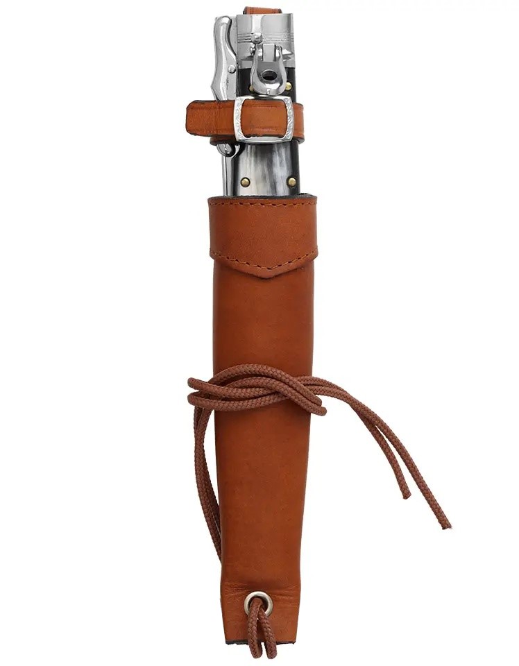適合獵人的完美刀款。折合時可用作剝皮器,打開時可用作小劍來切割骨頭或其他任何東西。馬尼亞戈製造。使用槓桿設計釋放刀刃。配有手工製作的皮革護套。
