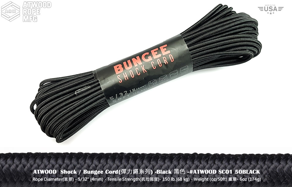 ATWOOD 5/32 Bungee Shock Cord 彈力傘繩 - 黑色 / 50呎