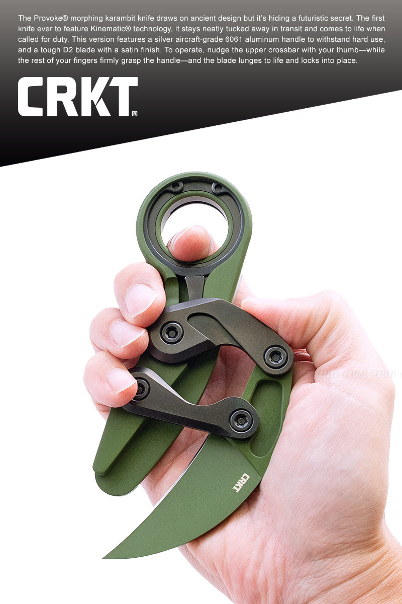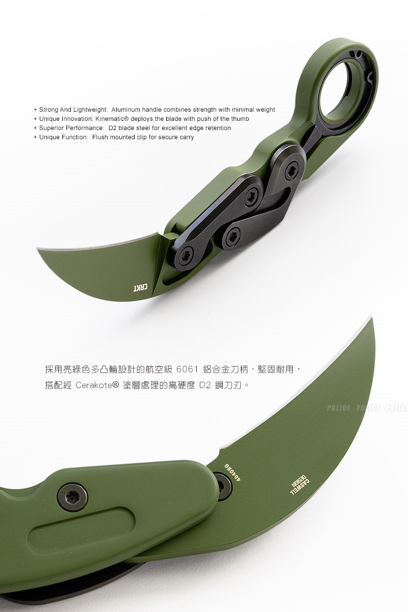 Provoke® 變形爪刀靈感源自古老的設計,卻蘊藏未來的秘密。這是全球首款採用 Kinematic® 技術的刀具,在攜帶時可巧妙收納,出任務時可迅速展開。此版本採用亮綠色多凸輪設計的航空級 6061 鋁合金刀柄,堅固耐用;搭配經 Cerakote® 塗層處理的高硬度 D2 鋼刀刃,提升耐磨與防腐蝕性能。使用時,只需以拇指輕推上方橫桿,並以其餘手指穩握刀柄,刀刃即迅速彈出並自動鎖定。想收刀時,輕撥指環底部的隱藏槓桿,刀刃便可順勢收回。特殊口袋夾設計——幾乎與刀柄完全齊平,僅需拇指輕壓即可啟用,方便又安全。