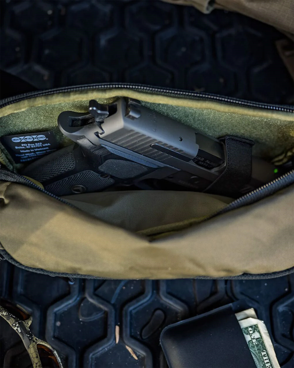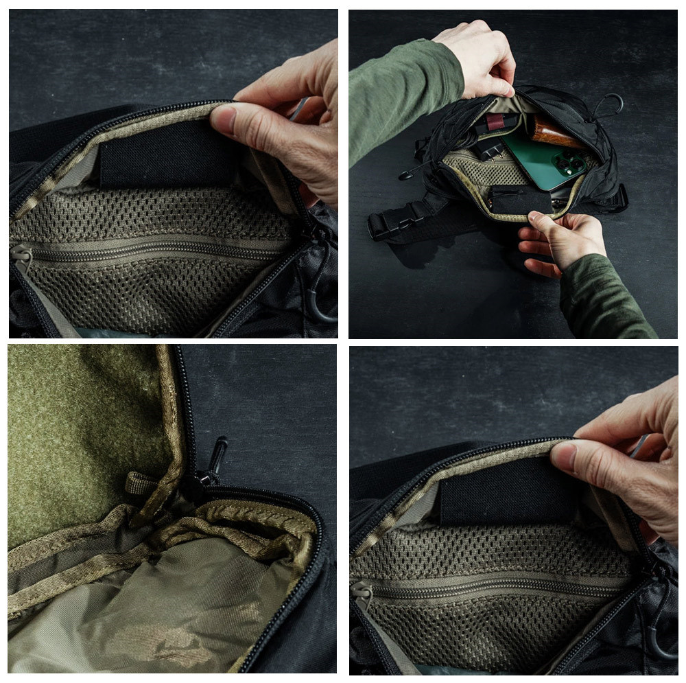 Bando 包就像彈藥帶一樣,輕鬆易攜,是您日常攜帶物品的理想之選。 Bando 包背面設有全拉鍊口袋,尺寸為 5.25 英寸(高)x 9.25 英寸(寬)x 3 英寸(深),足以容納大多數小型和緊湊型手槍,例如 Glock-19 以及尺寸相近的手槍。主隔層內設網狀拉鍊口袋和兩個插袋,方便您進一步整理物品。
