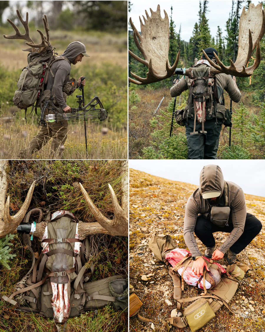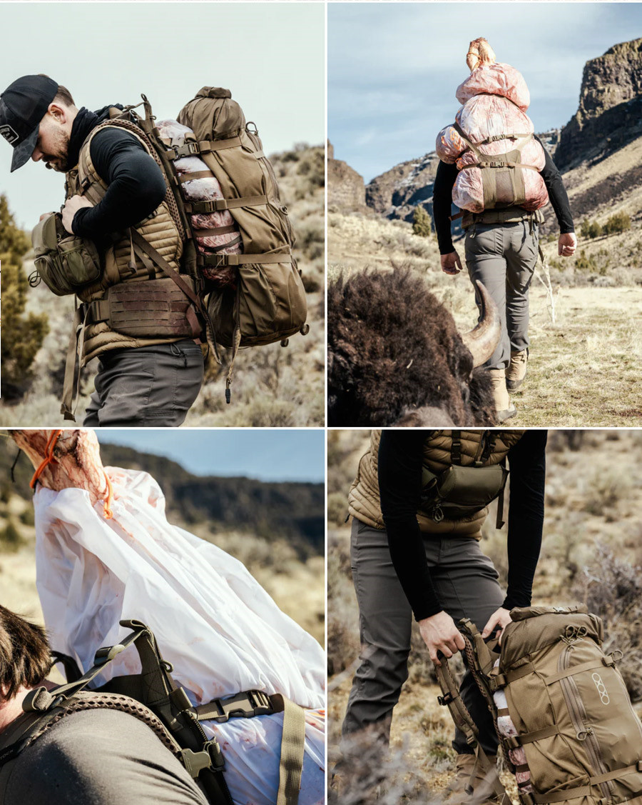 收拾裝備時,先卸下背包,將獵物袋固定在背包的承重板上,然後再重新背上背包。這樣可以把最重的重量壓在背部附近,減輕疲勞。