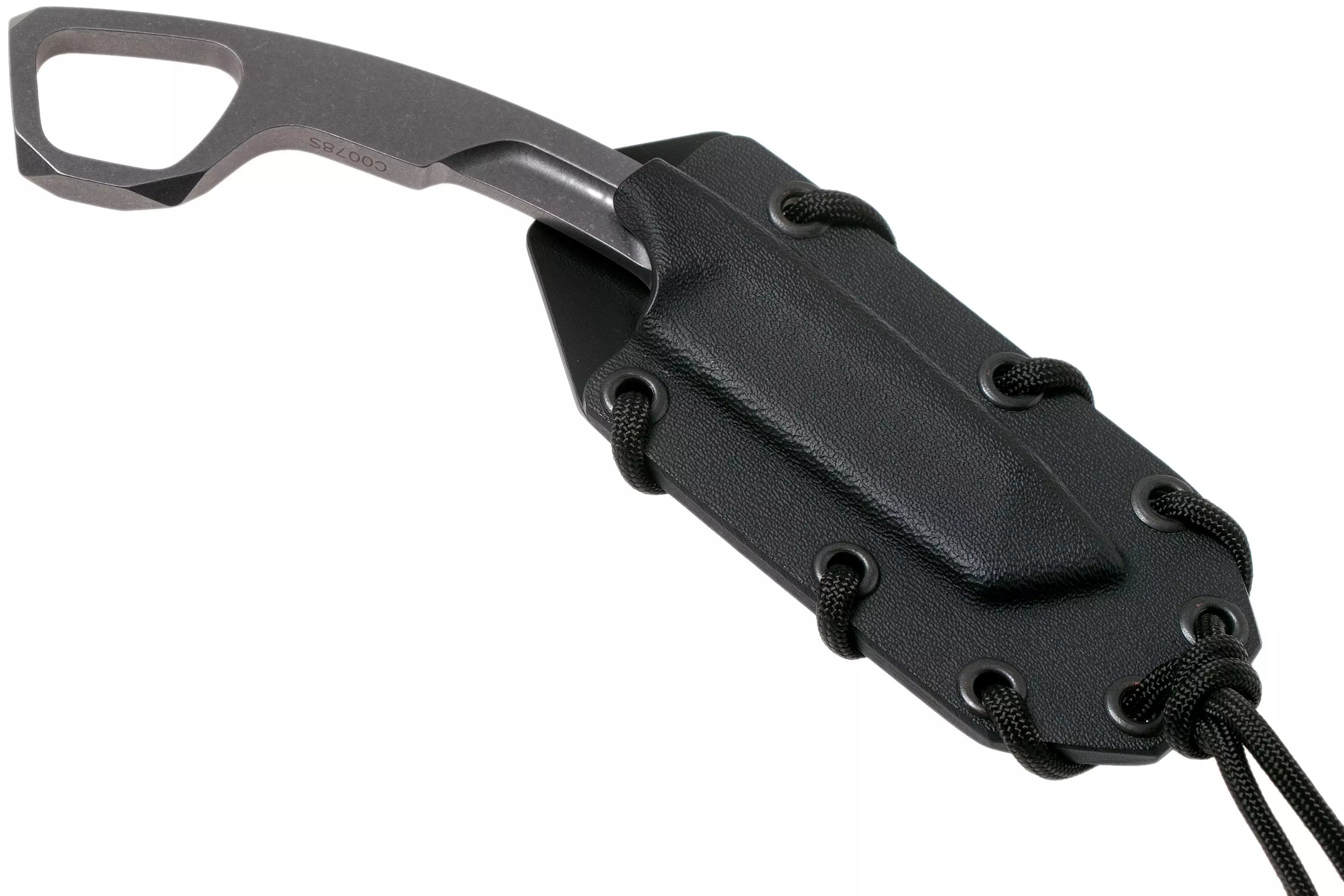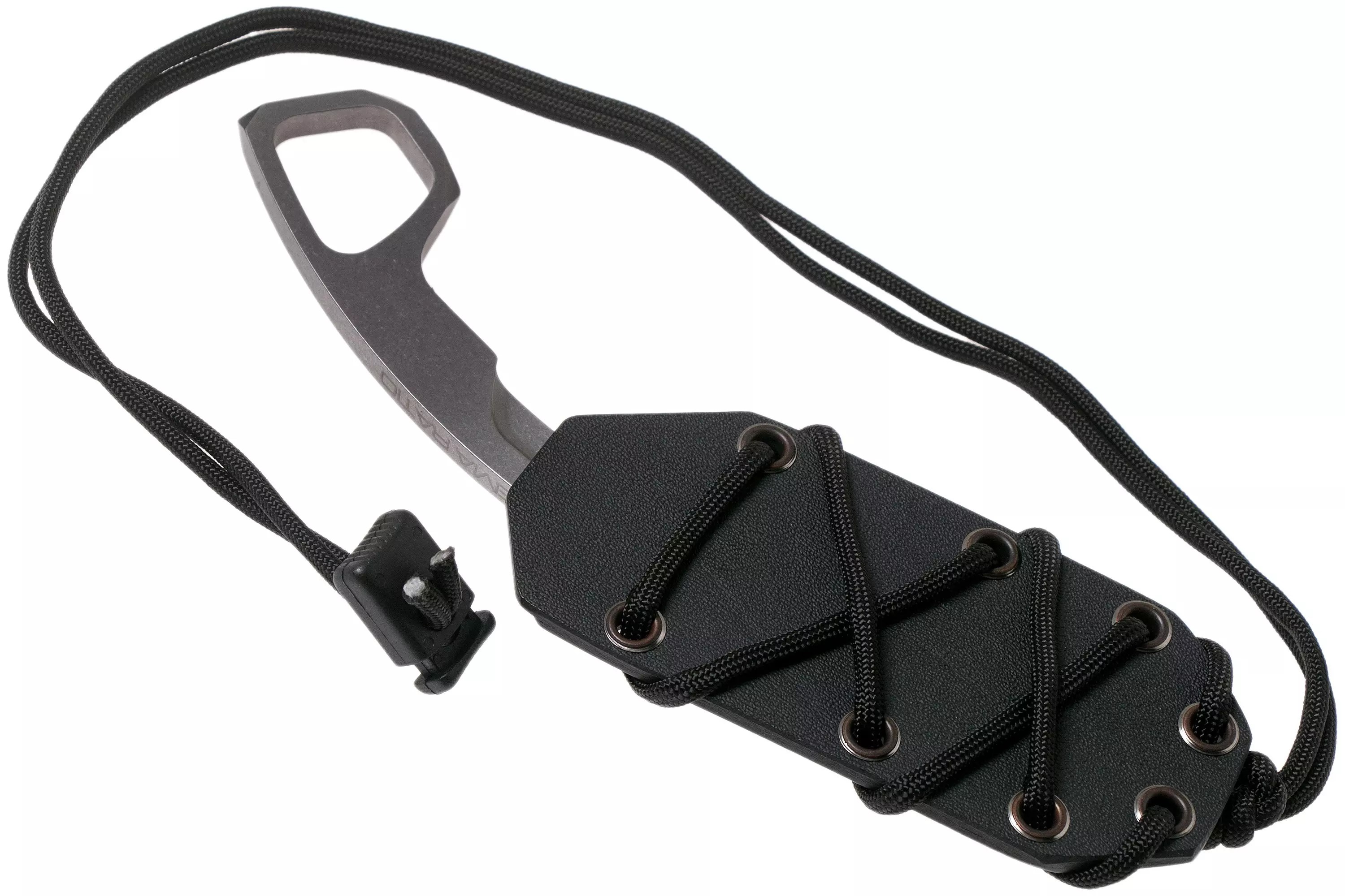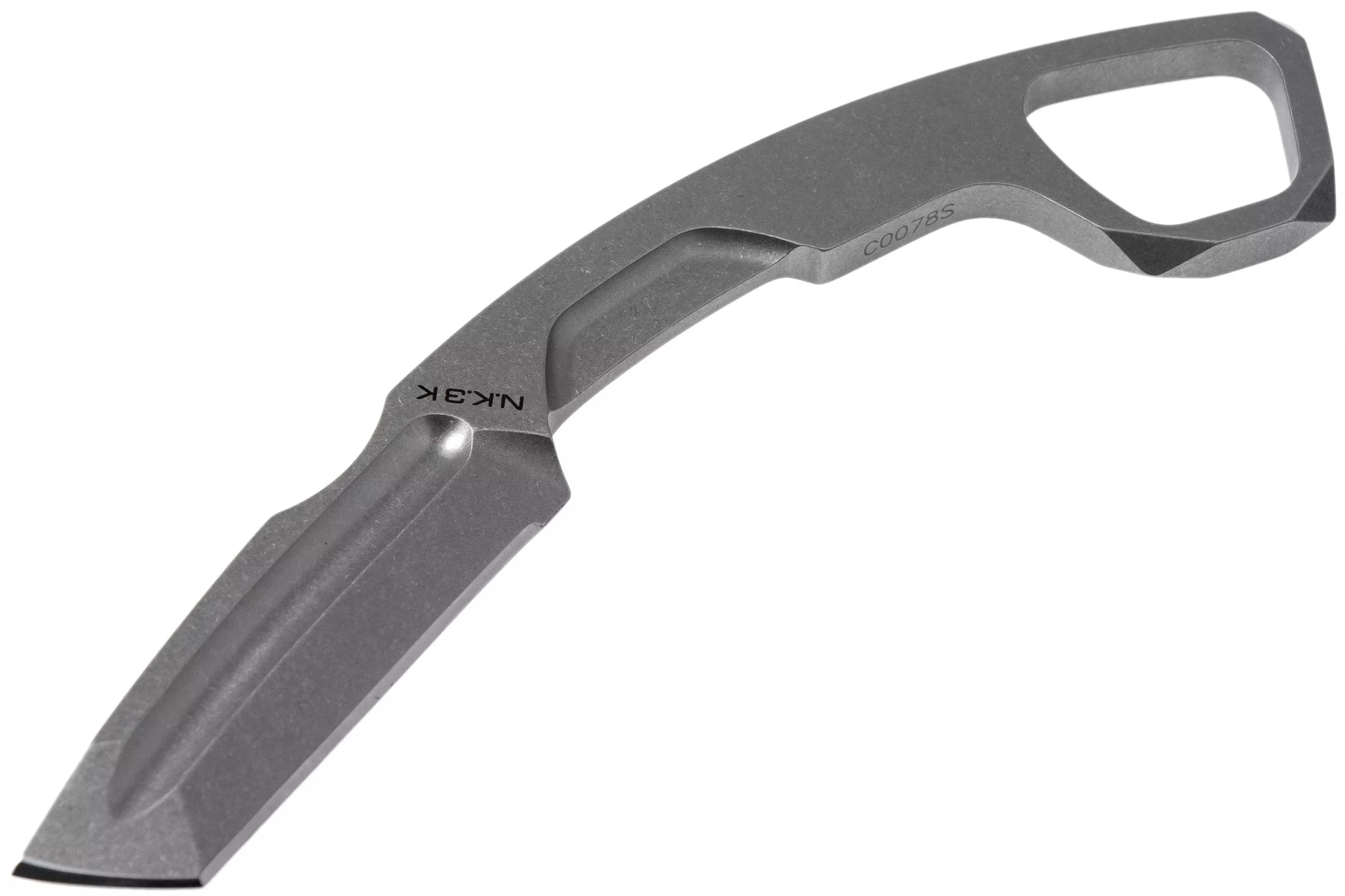 這把刀擴展了頸刀系列,它配備 N690 鋼短刀,刀片上有血紋槽,手柄後部有環。