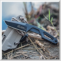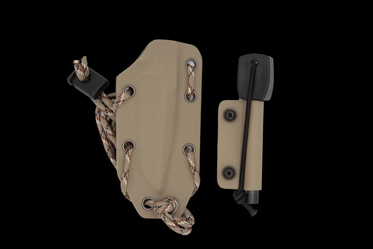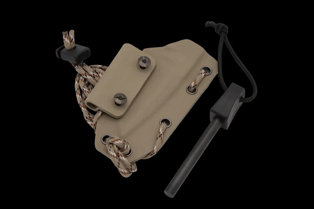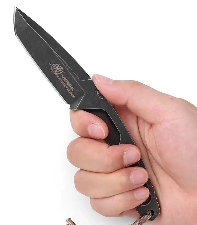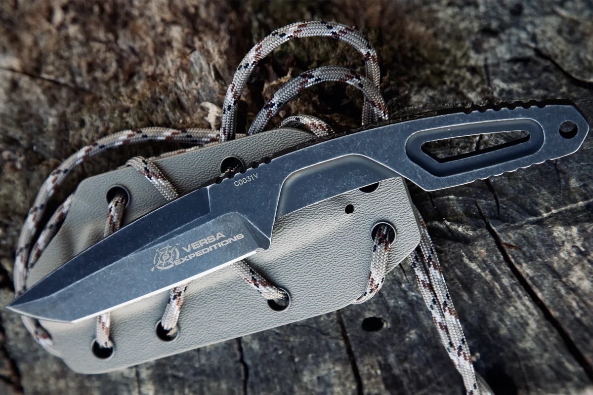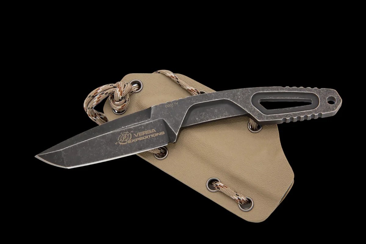全龍骨鏤空結構允許使用者透過纏繞傘繩來定製刀柄,進一步拓展刀具的用途和個性化選擇。全長 180 毫米,刀刃為 Tanto 型。 Kydex 刀鞘的設計方便快速且安全地拔刀。 Versa