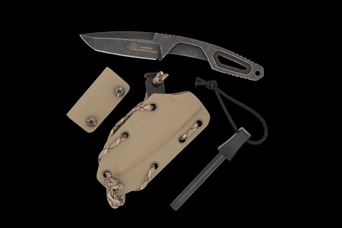 兩款型號均採用Böhler N690鋼材,經熱處理達到58 HRC硬度:Satin版本採用緞面拋光刀刃和黑色熱成型Kydex刀鞘,而Expeditions版本則採用MIL-C-13924藍化處理和石洗(深色石紋)表面處理。 Versa Expeditions 配備沙漠色熱成型 Kydex 刀鞘,可用於固定隨附的打火棒,方便生火。 Versa 是一款一體式直刀,由一整塊 Bohler N690 鋼材加工而成。其符合人體工學的設計,確保使用時的最大舒適性和安全性。