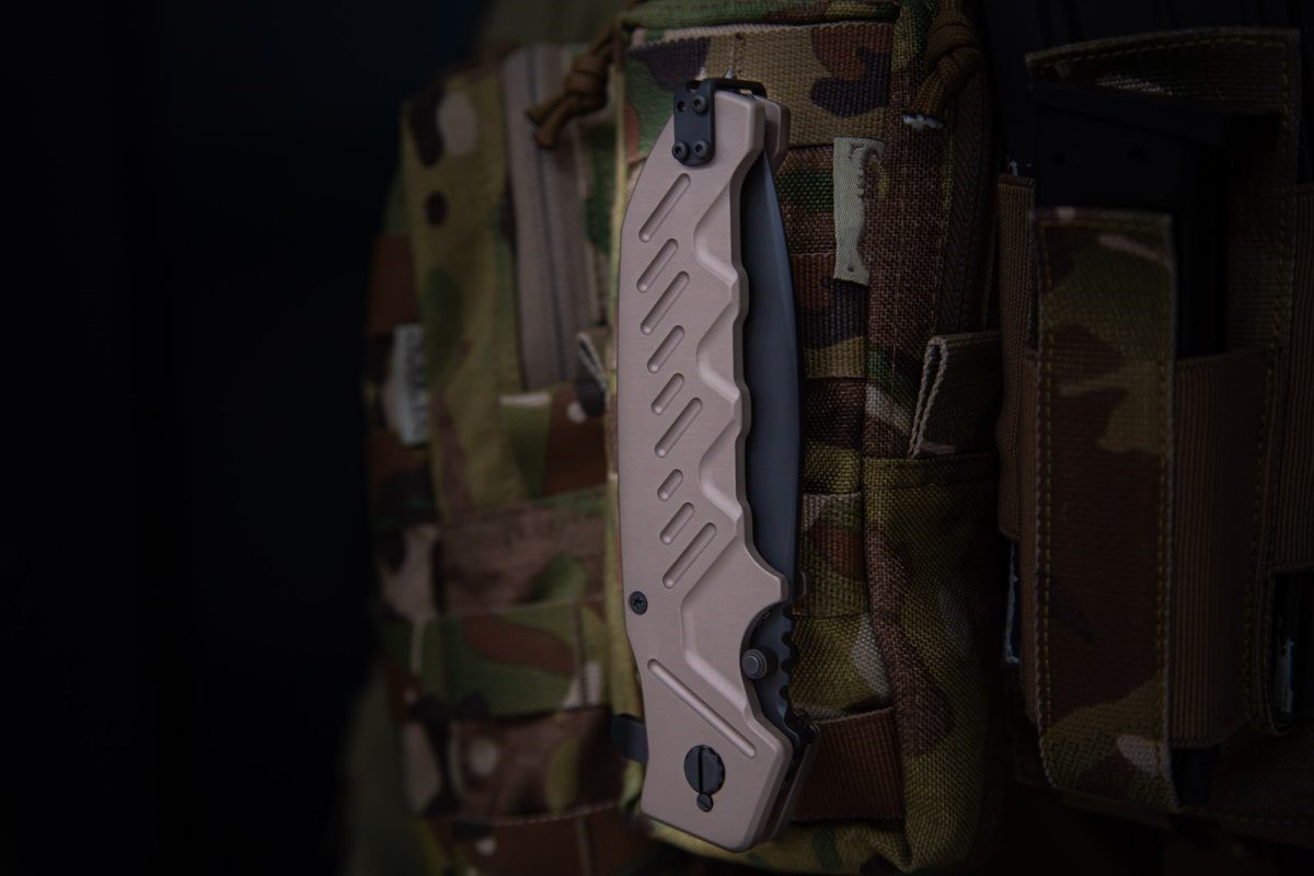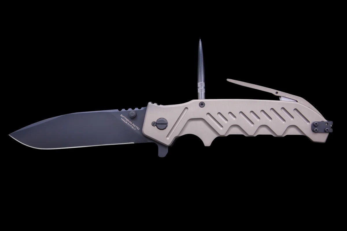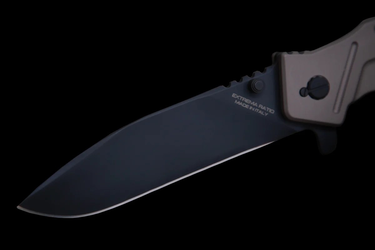 刀刃鎖定係統採用久經考驗的線鎖鎖定係統,並配有可手動啟動的第二重安全機制。水滴形刀刃採用 Böhler N690 鋼材製成,硬度達 58 HRC,並採用經典的 Extrema Ratio MIL-C-13924 黑色塗層。