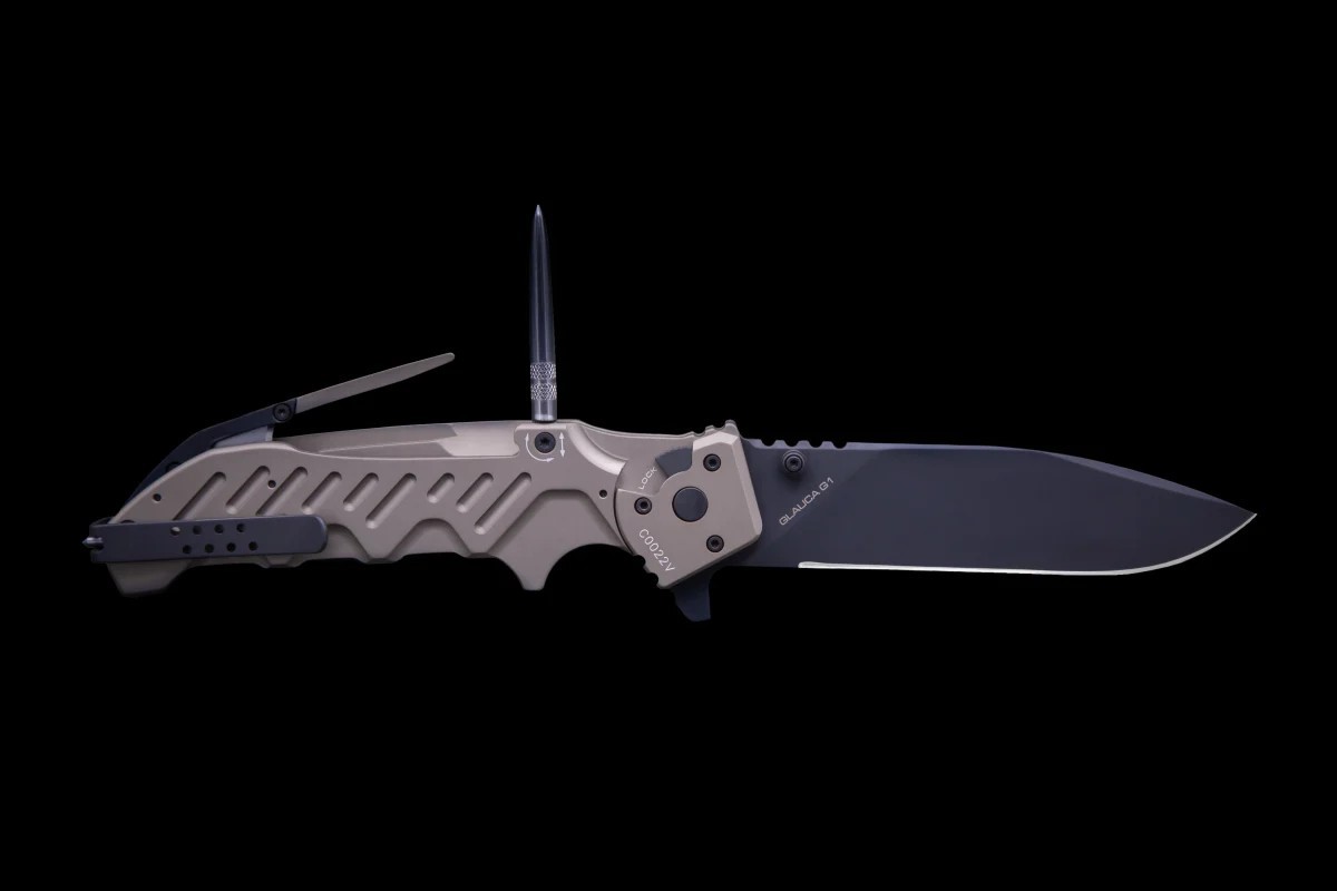 Glauca G1 是 Glauca 型號的升級版,其特色功能專為德國聯邦警察特種部隊 GSG9 而設計,並已正式被該部隊採用。手柄採用戰術泥色陽極氧化處理的防腐蝕鋁合金製成,並配備後置碳化鎢破窗器。刀夾可調整至兩個不同位置(其中一個位於正面)。刀背配有可鎖定在打開位置的不銹鋼繩結解開器和一個可折疊的救援工具,方便操作者快速進行緊急切割,解救受困者。此救援工具也可作為安全帶切割器使用。