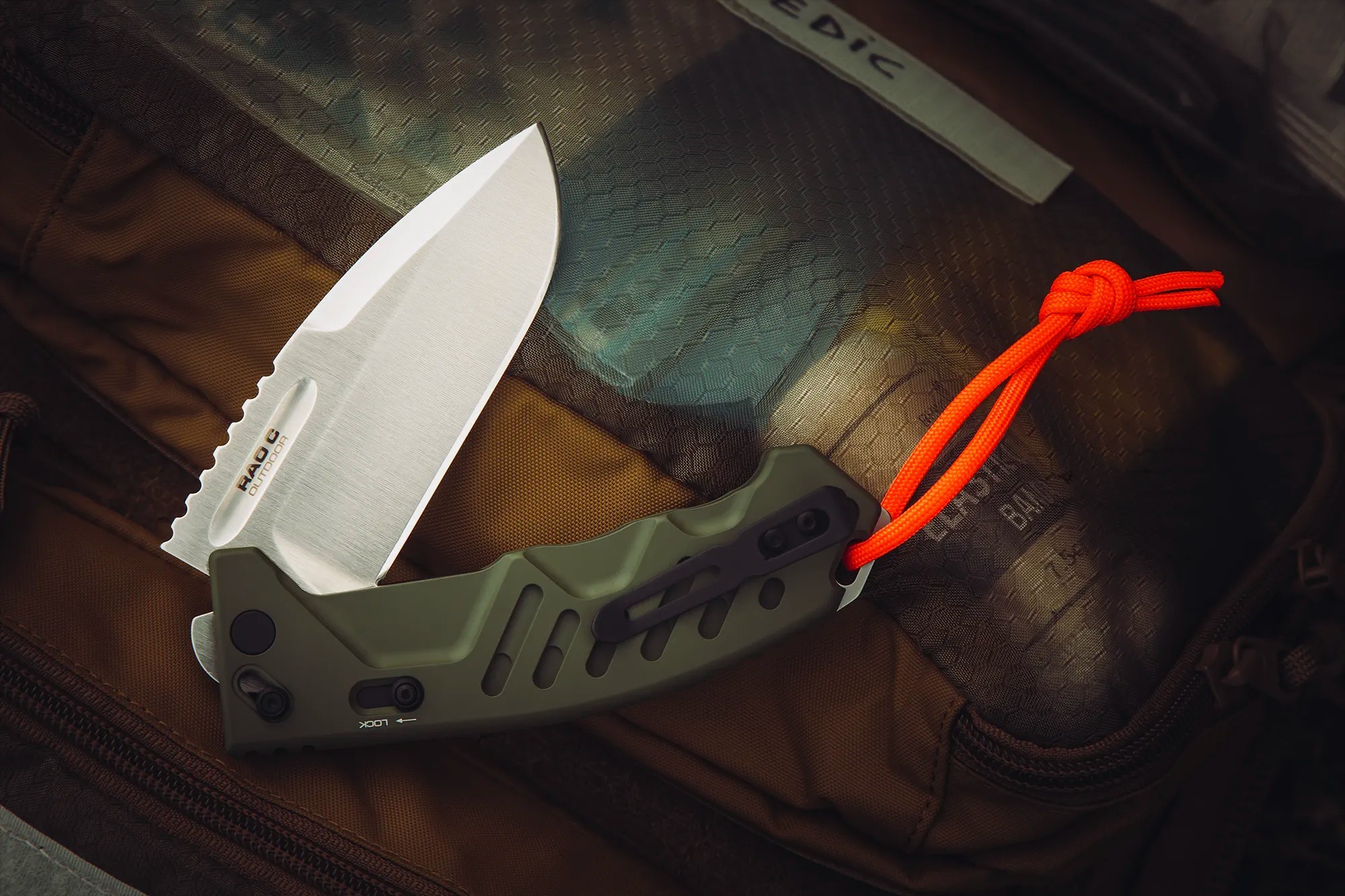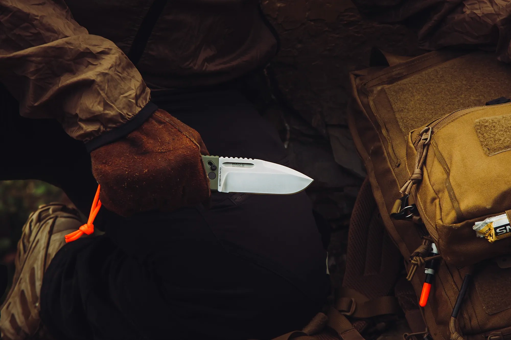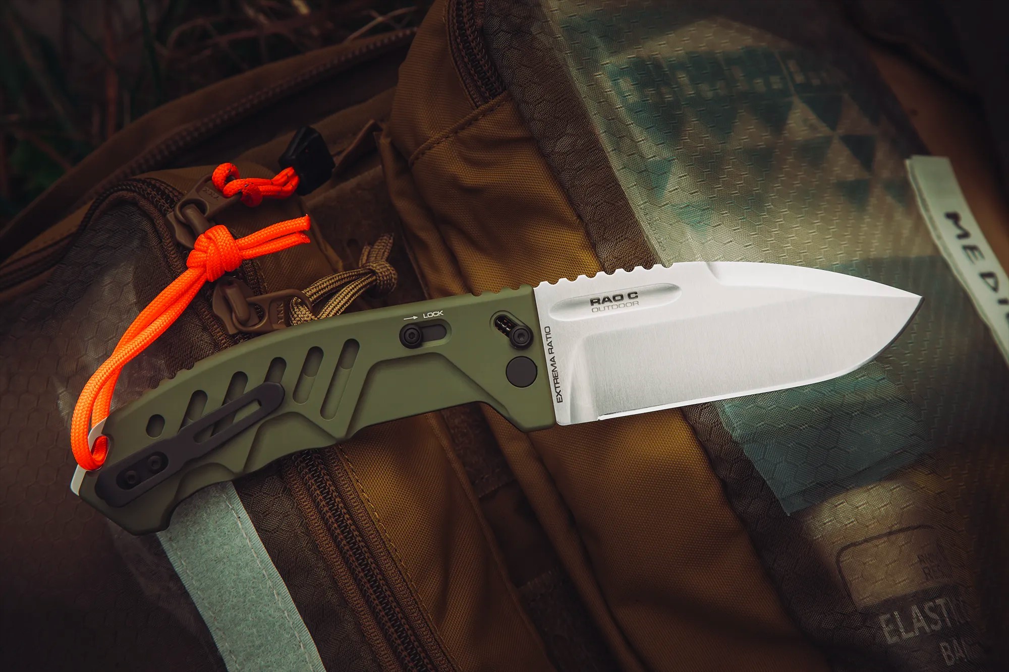 Extrema Ratio Outdoor系列的設計概念很簡單:戶外活動時,多餘的東西會成為負擔。該系列專為野外使用而設計,採用專門的表面處理和解決方案:環保的綠色手柄、易於保養的石洗或緞面刀刃、高可見度的傘繩以及必備的耐用刀鞘。