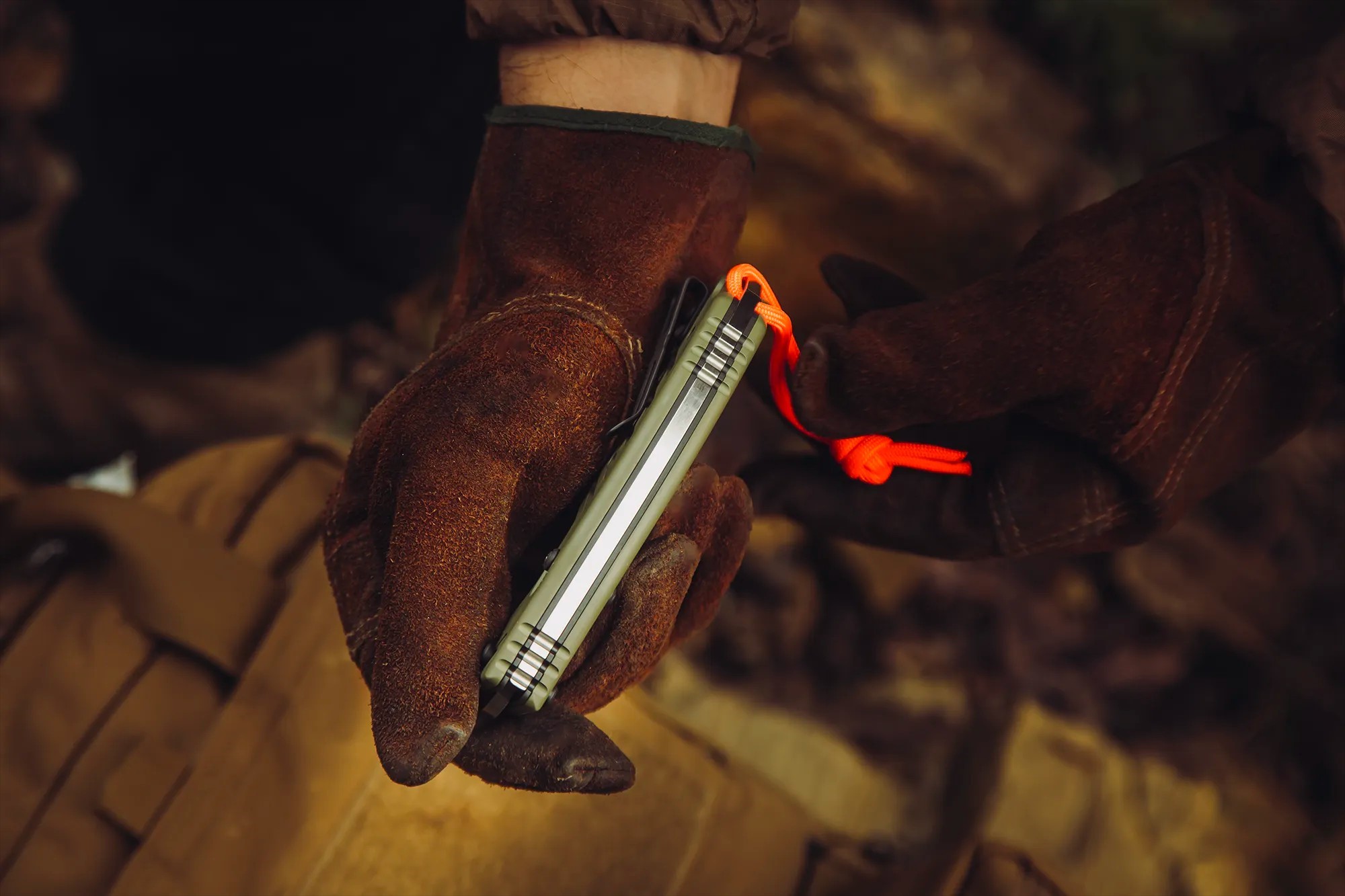 戶外款的綠色鱗片增強了其與自然環境的視覺融合。醒目的橙色傘繩掛繩則增添了實用的安全功能:即使工具掉入植被或地面,也能快速找回。