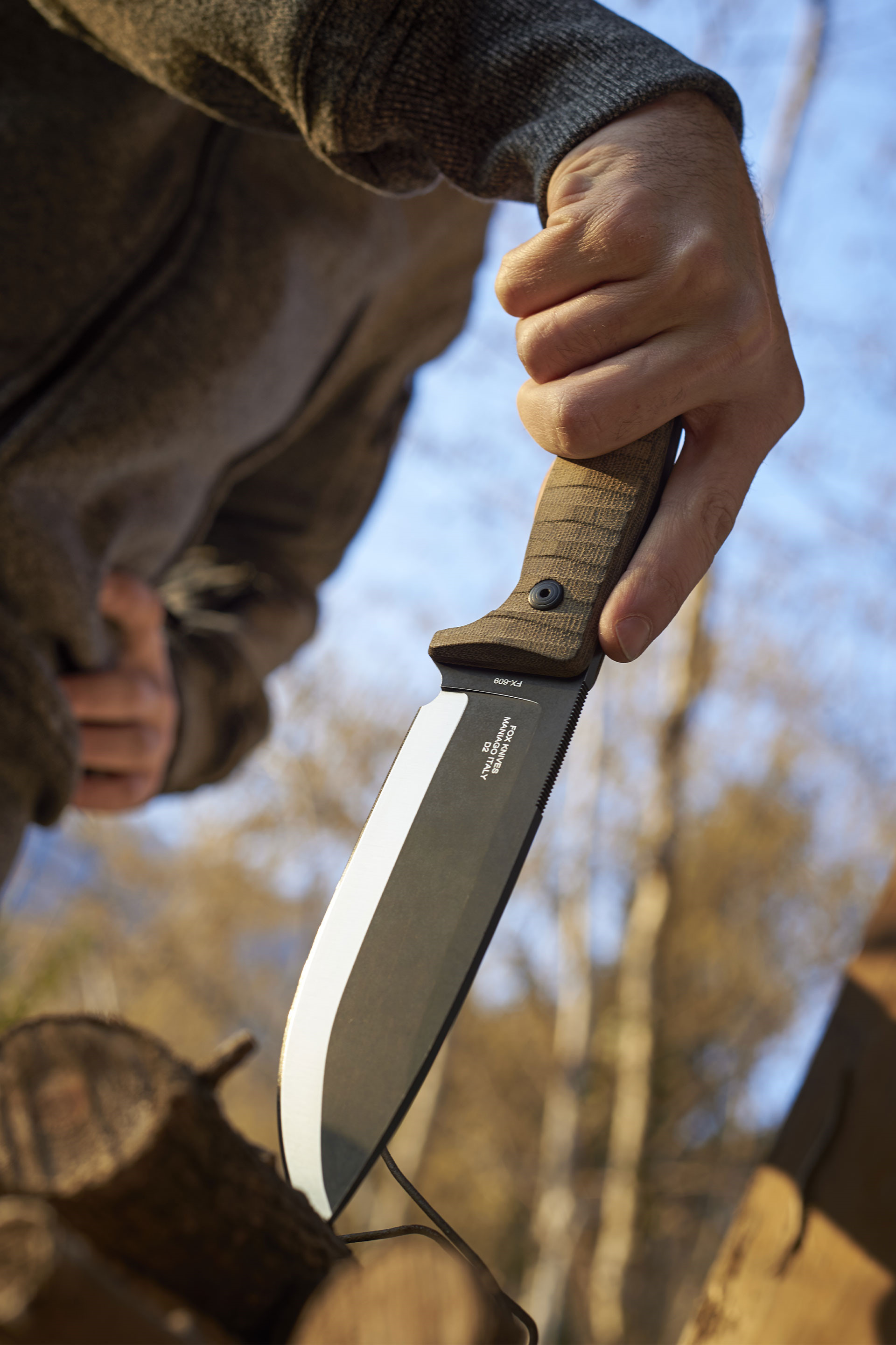 Bushman 是一款堅固耐用的多功能刀具,旨在輕鬆有效地應對野外生存挑戰。其高強度刀刃即使在最極端的條件下也能保持卓越的耐用性和易於打磨的特性。刀刃採用多用途設計,寬闊的平面可用於挖掘和雕刻,而鋒利的刀尖則可用於木工等精細操作。