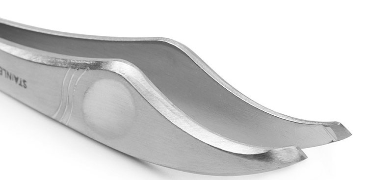 前端為斜面設計,因此可以容易的看見毛髮,使用嚴選厚度2mm堅固不銹鋼材質,利用鍛造方式製作而成,具有很高的金屬密度和韌性,手指頭握的部位凹槽設計,握感佳且省力。