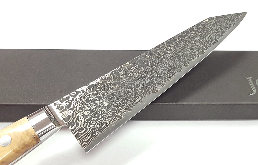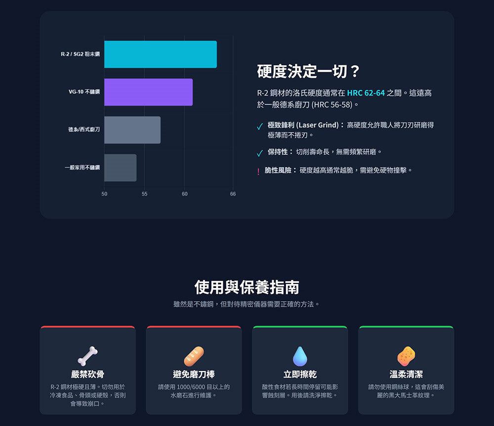 ●充分發揮R-2鋼的潛力: 這款傳統錘鍛大馬士革刀刃的核心鋼材由工藝大師後藤先生甄選,即粉末冶金高速工具鋼「R-2」(又稱「SG-II」)。這款卓越的鋼材由日本著名企業神鋼(Kobelco)精心打造,經過穩定可靠的熱處理工藝(採用鹽浴法),硬度高達HRc 63。最終成就了無與倫比的切割性能、鋒利保持性和耐腐蝕性。