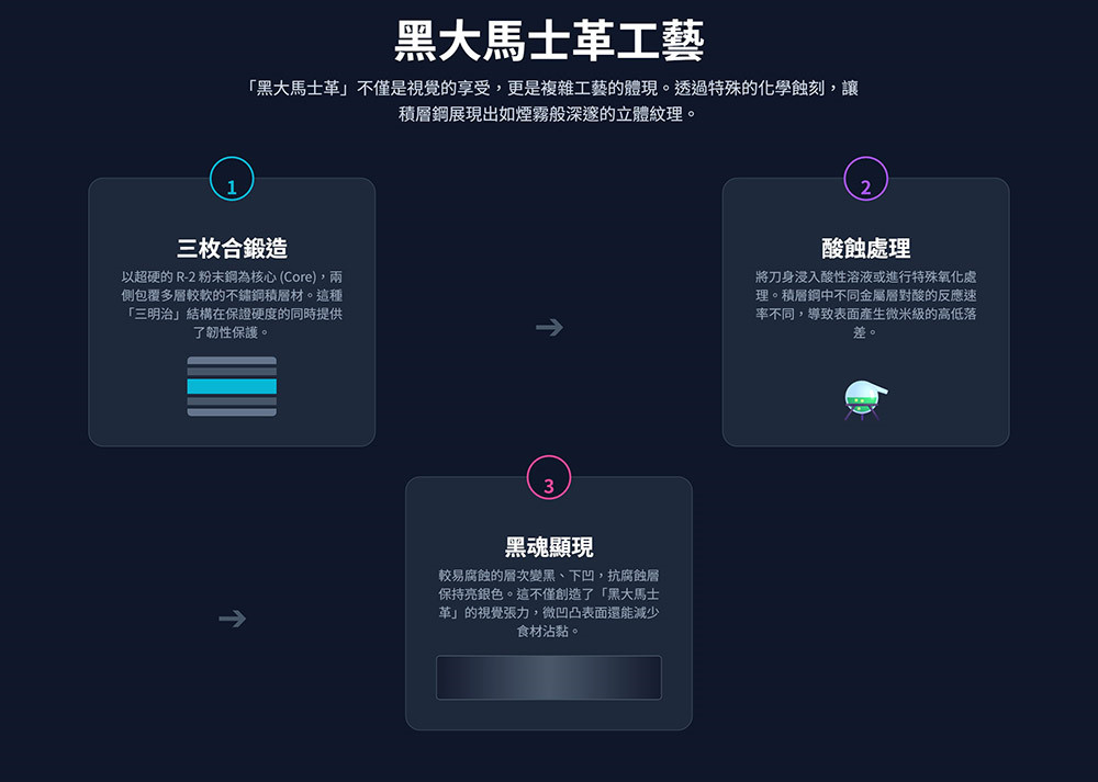 ●大馬士革鋼工藝: 刀刃表面呈現出複雜而獨特的大馬士革鋼紋路,這是透過精湛的鍛造工藝打造而成。霧面黑色的刀刃上點綴著閃亮的鎳鋼層,宛如銀色的光澤。技藝精湛的工匠在製作大馬士革刀刃的過程中,採用鏡面拋光工藝,打造出這些交替的拋光層。這得歸功於工匠們無數小時的製刀經驗和對傳統製刀工藝的深刻理解。這種卓越的組合不僅提升了刀具的視覺美感,更體現了超越美學的匠心精神。如此精美的大馬士革刀刃和斑紋木手柄的色彩,不禁讓人聯想到令人嘆為觀止的永恆「大峽谷」。