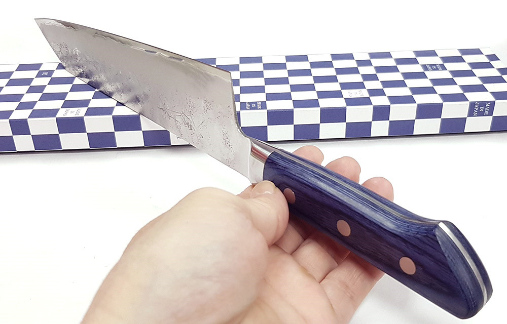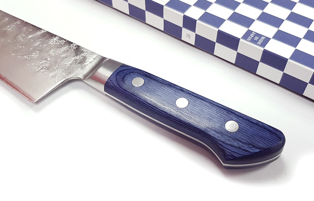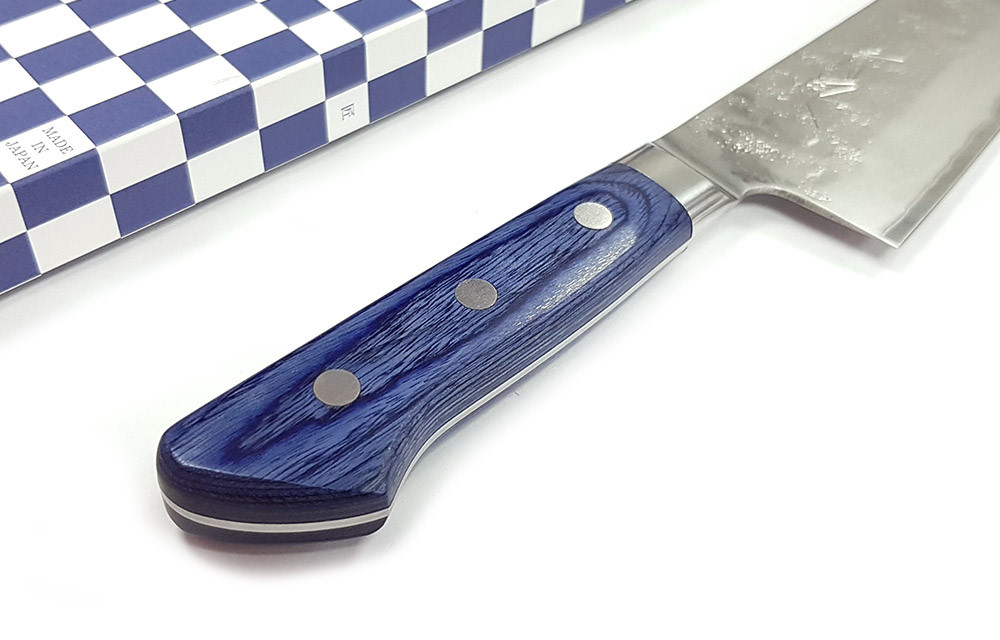 ●這款刀具採用精緻的皇家藍紫色帕卡木手柄,與 Nashiji 紋理的青紙2號鋼切付 刀刃完美契合。刀具採用全龍骨結構,鍛造不銹鋼刀枕和不銹鋼手柄鉚釘。帕卡木堅固耐用,防水防縮。