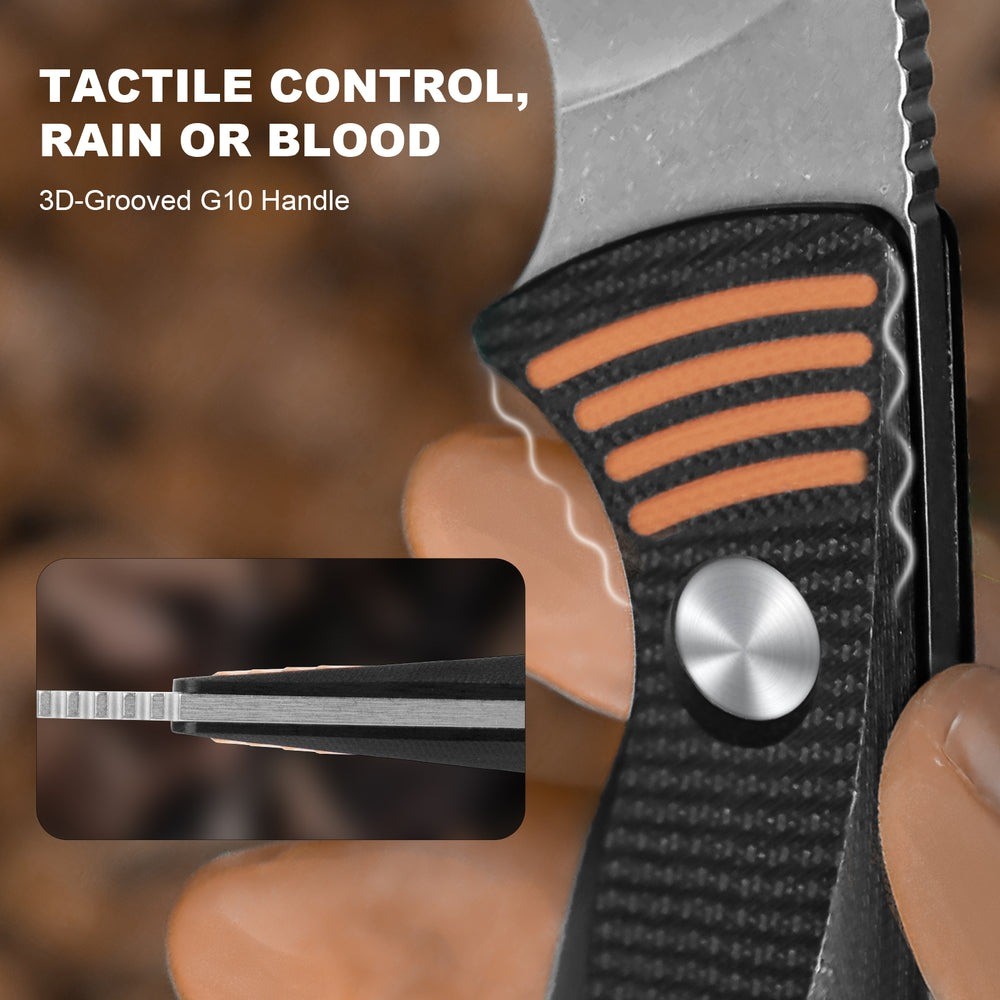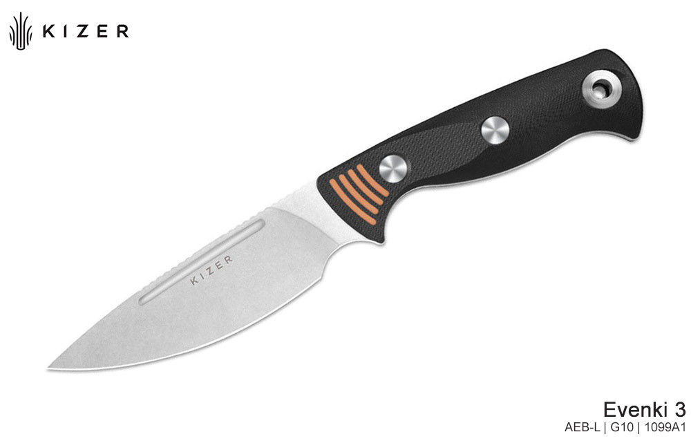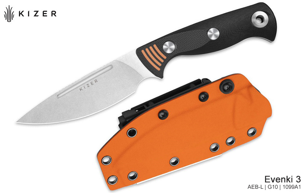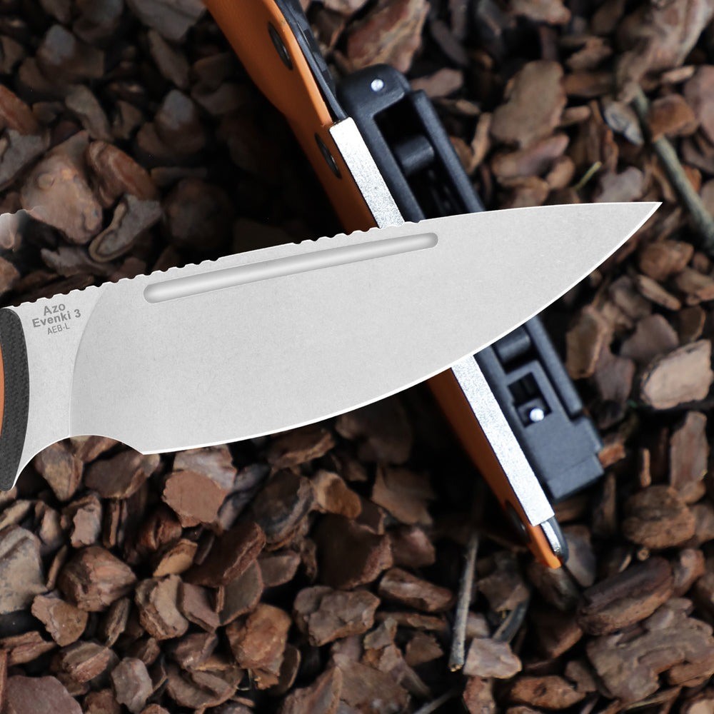 ●Kizer Evenki 3 1099A1 是一款由知名刀具設計師 Azo 精心打造的直刀。其醒目的黑橙配色與光滑的銀色刀刃相得益彰,營造出極具視覺衝擊力的對比效果。刀刃採用 AEB-L 鋼材製成,具有流暢的水滴形刀尖,這種鋼材以其卓越的鋒利度保持性和耐腐蝕性而聞名。經過石洗處理,刀刃散發出一種既堅固耐用又精緻優雅的美感。