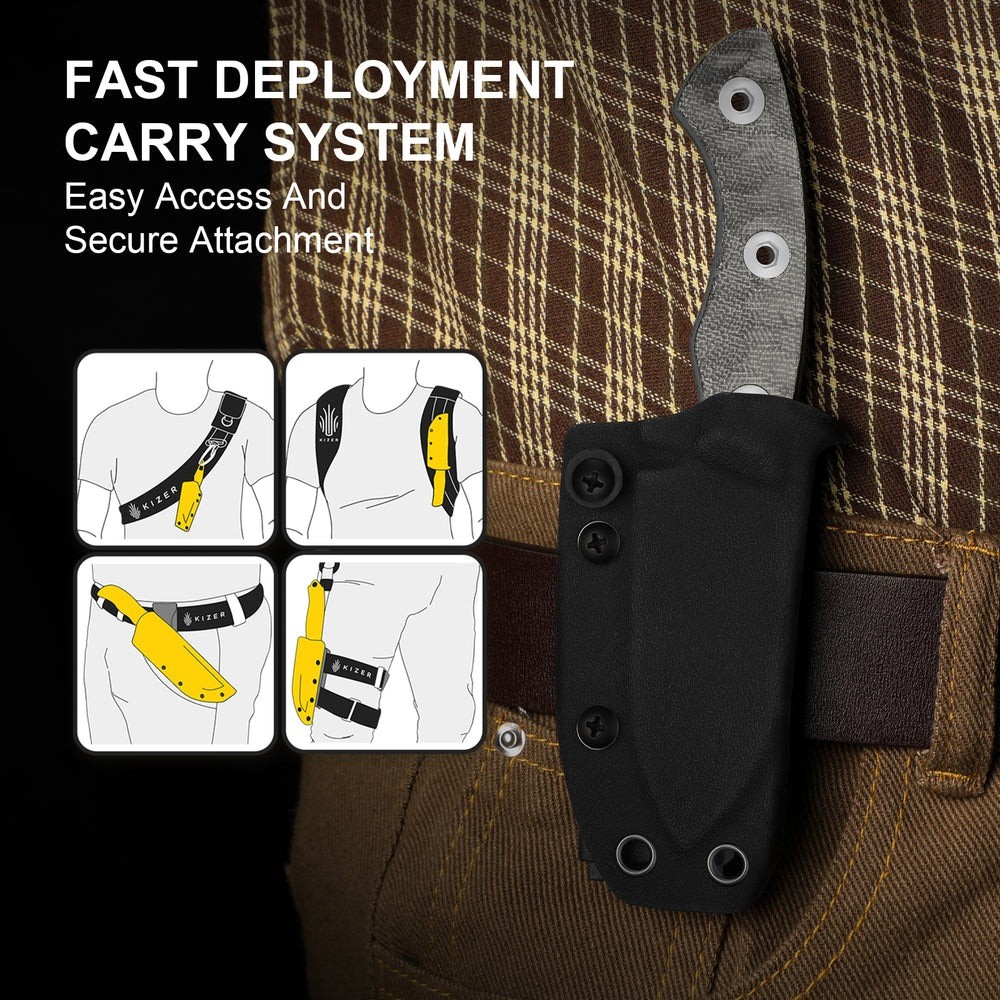 Kydex刀鞘極為耐用,可牢固地固定在腰帶、口袋或裝備上。它方便快速取用和可靠攜帶,是日常攜帶 (EDC) 和戶外探險的理想之選。