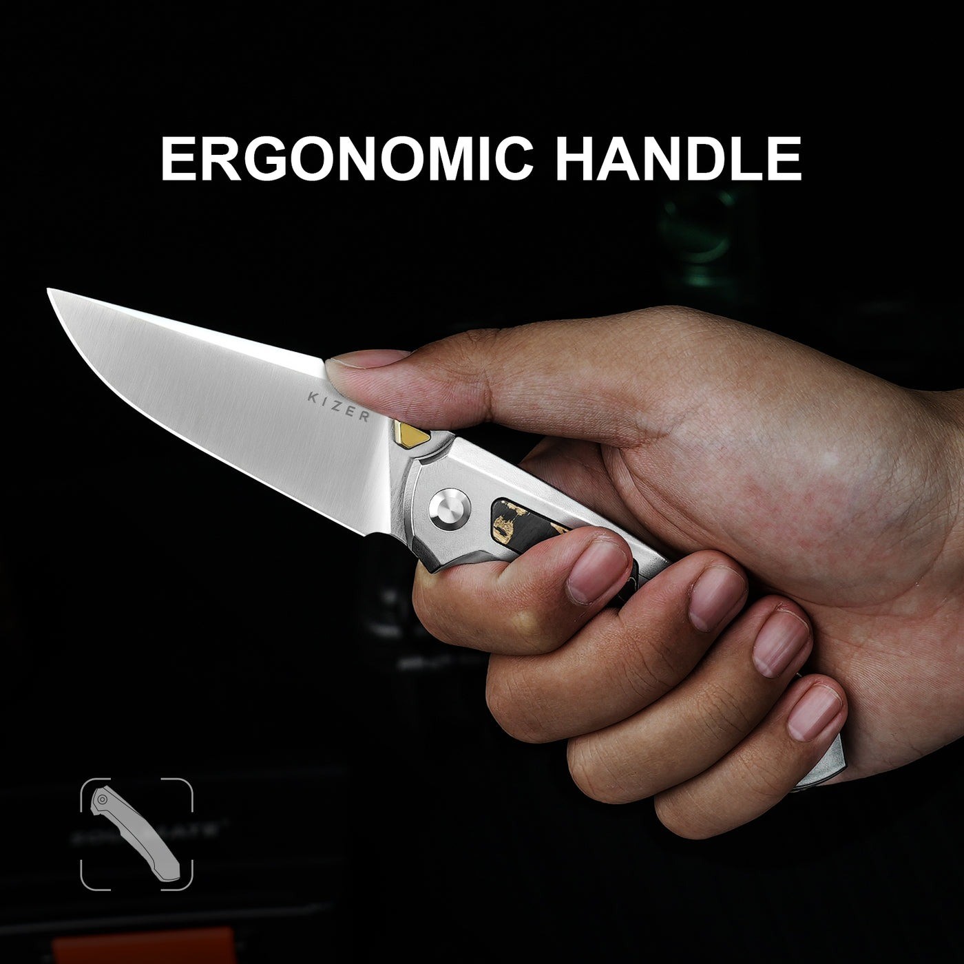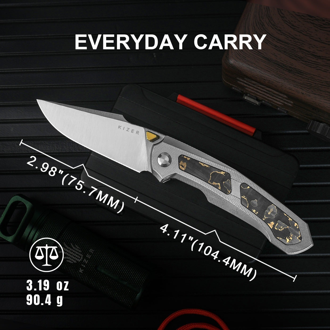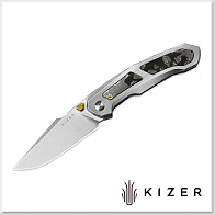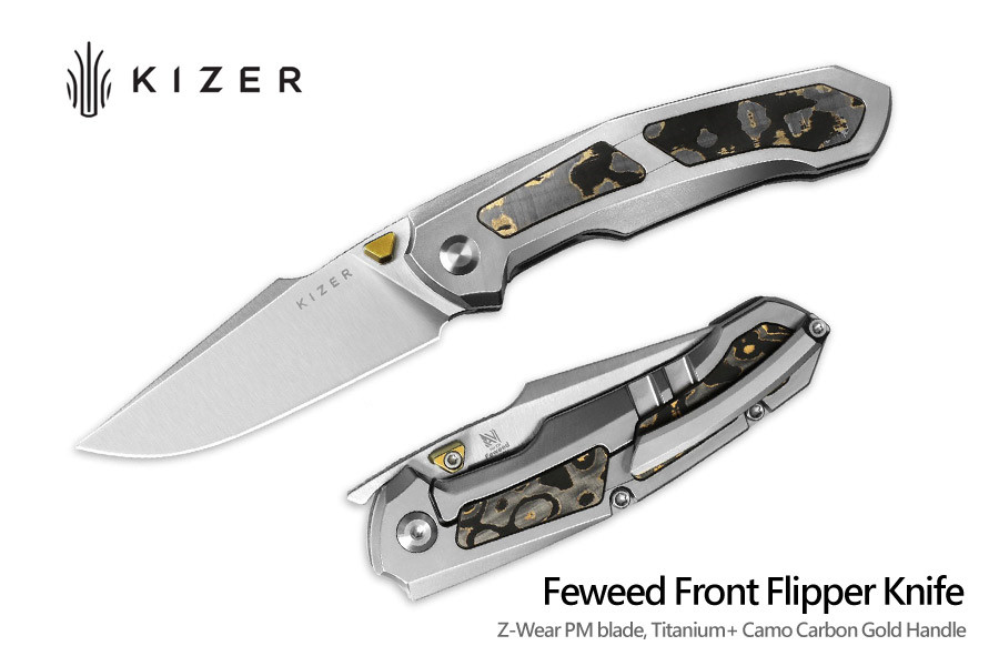 Kizer Feweed由刀具設計師 Vũ Huỳnh Nam Anh設計,Kizer Feweed 刀片採用優質Z-Wear鋼製成以出色的耐磨性、韌性和耐腐蝕性而聞名,採用緞面刀片,帶來精緻舒適的切割體驗。採用現代材質,搭配未來感十足的鑲嵌物和拇指釘,堪稱精湛的工藝傑作。正如我們對 Kizer 的期待,其表面處理幾乎完美無瑕。這款折刀提供多種表面處理和鋼材選擇。手柄採用噴砂鈦金屬與Camo Carbon Gold碳纖維鑲嵌物搭配,營造出醒目的配色方案,既實用又引人注目。前鰭狀肢和拇指螺柱可實現順暢、靈活的展開,而框架鎖和鈦金屬背夾則可提供安全、時尚的攜帶體驗。它是日常攜帶和艱鉅任務的理想選擇。