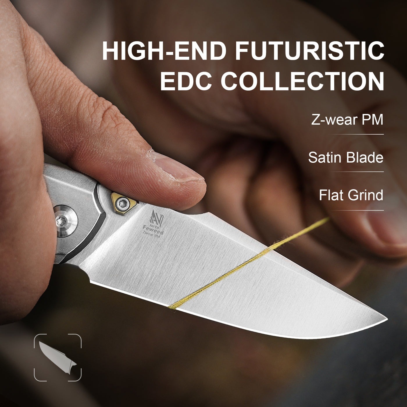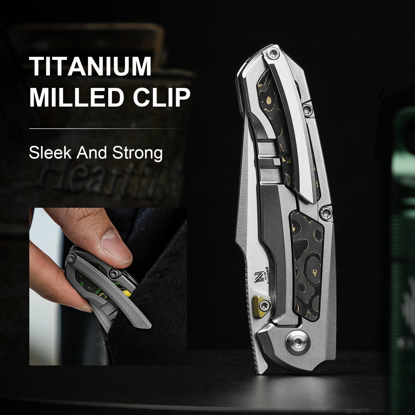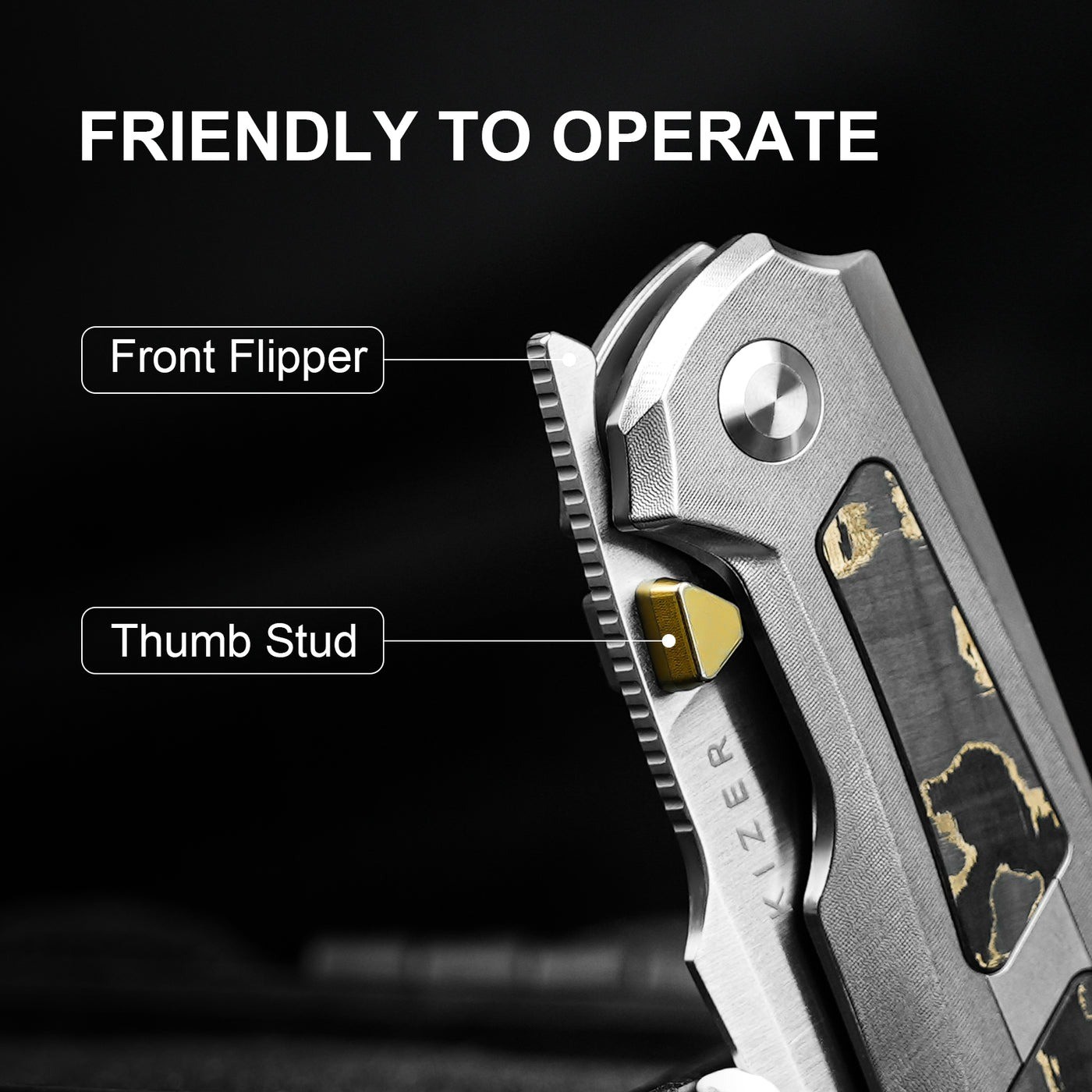 Kizer Feweed由刀具設計師 Vũ Huỳnh Nam Anh設計,Kizer Feweed 刀片採用優質Z-Wear鋼製成以出色的耐磨性、韌性和耐腐蝕性而聞名,採用緞面刀片,帶來精緻舒適的切割體驗。採用現代材質,搭配未來感十足的鑲嵌物和拇指釘,堪稱精湛的工藝傑作。正如我們對 Kizer 的期待,其表面處理幾乎完美無瑕。這款折刀提供多種表面處理和鋼材選擇。手柄採用噴砂鈦金屬與Camo Carbon Gold碳纖維鑲嵌物搭配,營造出醒目的配色方案,既實用又引人注目。前鰭狀肢和拇指螺柱可實現順暢、靈活的展開,而框架鎖和鈦金屬背夾則可提供安全、時尚的攜帶體驗。它是日常攜帶和艱鉅任務的理想選擇。
