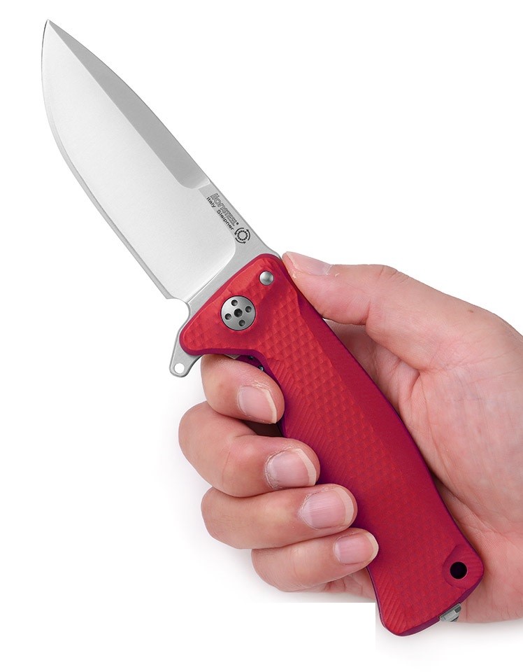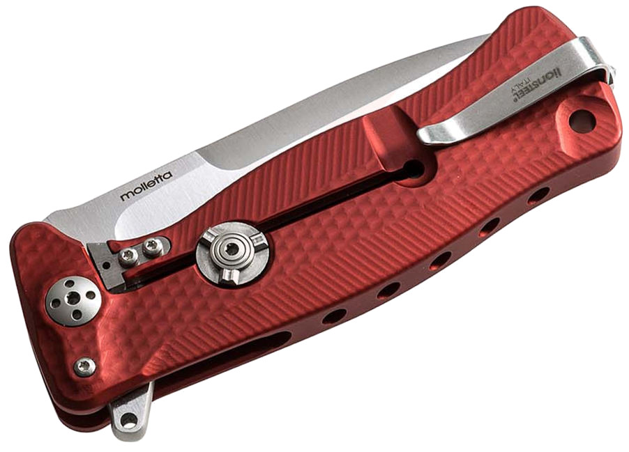 LionSteel的SR1在2010年的亞特蘭大Blade Show展榮獲最具創新設計進口刀具獎。SR11為SR1的升級版,由Michele Pensato先生設計。 SR11升級了滾珠式軸承,使他變成更加方便的Flipper快開折刀,和專利的Rotoblock系統,可以利用Rotoblock卡榫卡住墊片、使用上多一層防護。刀刃採用瑞典Uddeholm公司所生產的Sleipner冷沖壓模具鋼,硬度高達60-61HRC,切割能力非常優秀。握柄採用紅色陽極氧化塗層的鋁合金,保留SR1的設計風格,底部設有碳化鎢材質的玻璃擊破裝置,和6AL-4V航鈦合金的口袋夾。 SR11絕對是您作為EDC每日攜帶刀的首選,驕傲的在義大利製造。