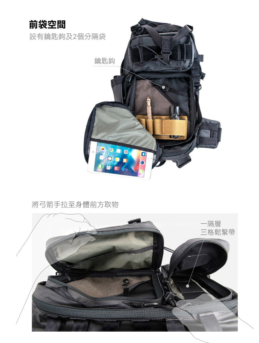 袋口特殊方向設計,不須卸下包包即可在胸前快速而方便的開袋拿取。