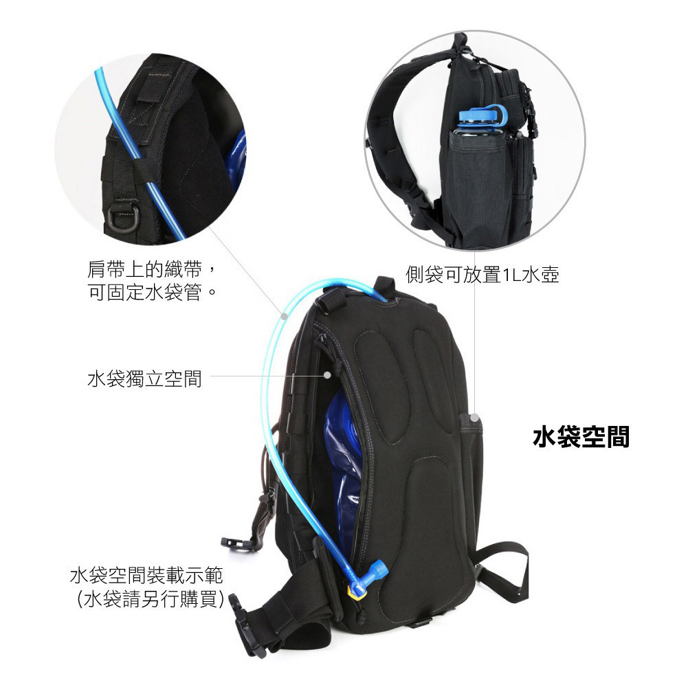外部配置水壺插袋,內部具水袋倉並有吸管孔。