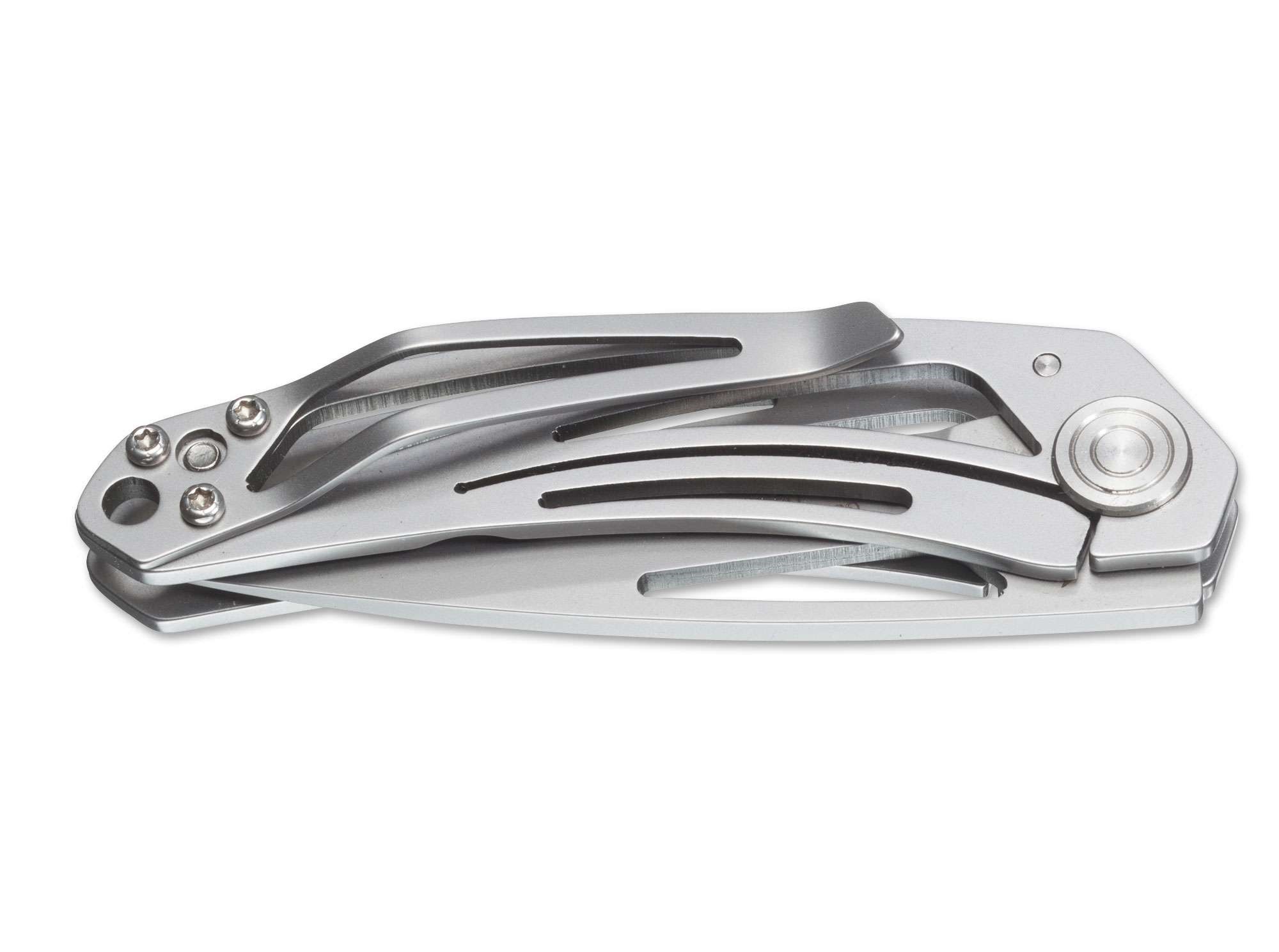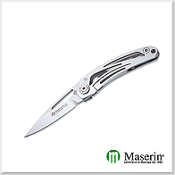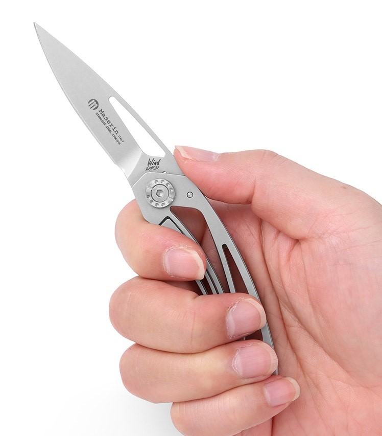 Maserin Wind 不鏽鋼折刀,刀刃採用Z70CD15不銹鋼,獨特的鏤空流線不鏽鋼握柄設計,有如其名稱「Wind」般的輕盈,僅重50公克,背夾搭配鏤空流線設計,令人耳目一新。全長14.6公分,屬於袖珍型折刀與紳士折刀,非常適合作為隨身用刀。