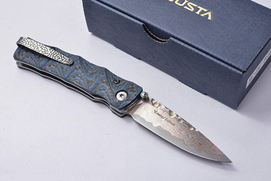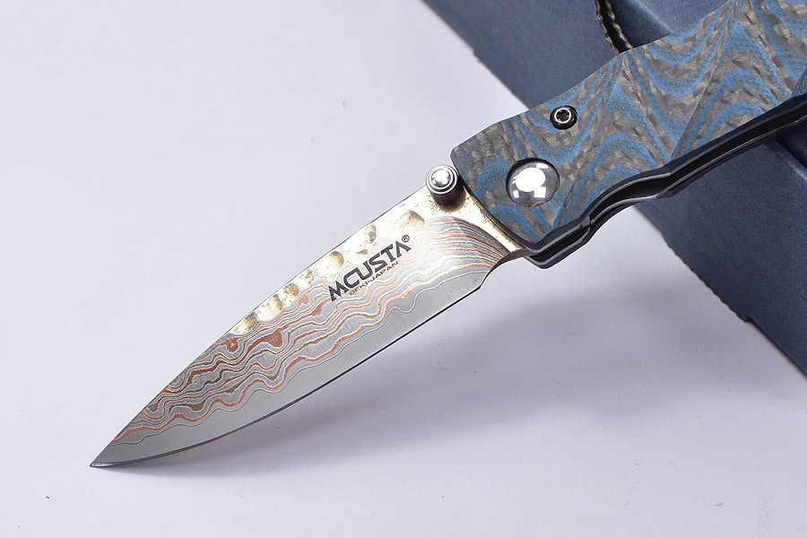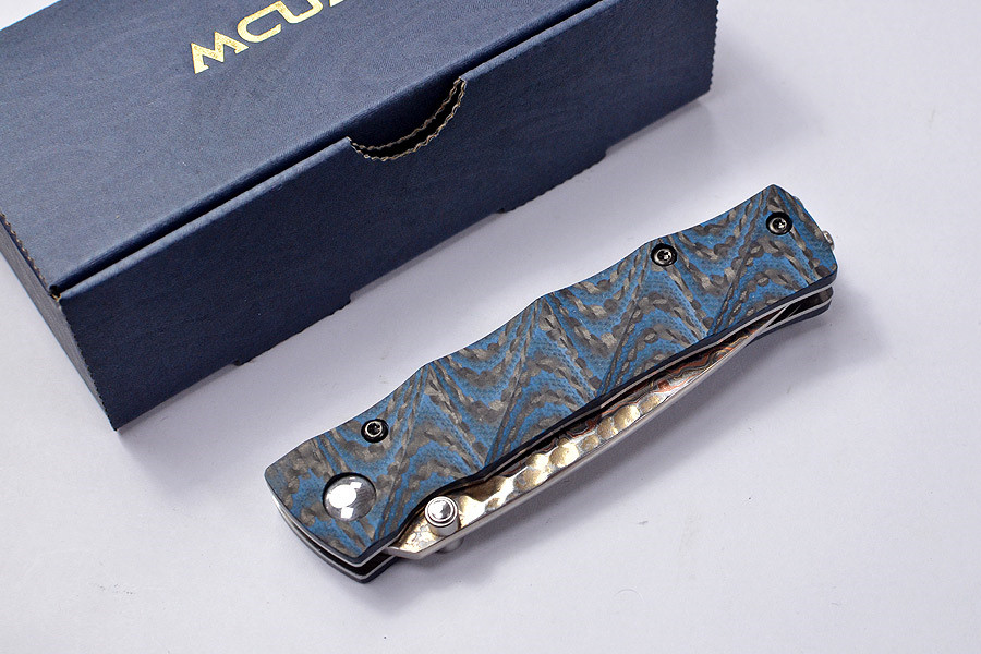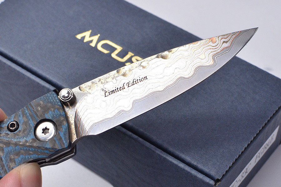 日本 MCUSTA 25周年紀念-黑碳纖+藍G10柄鉬木金33層大馬士革鋼折刀 【全球限量50把】