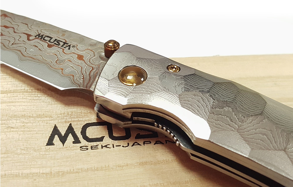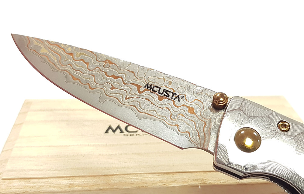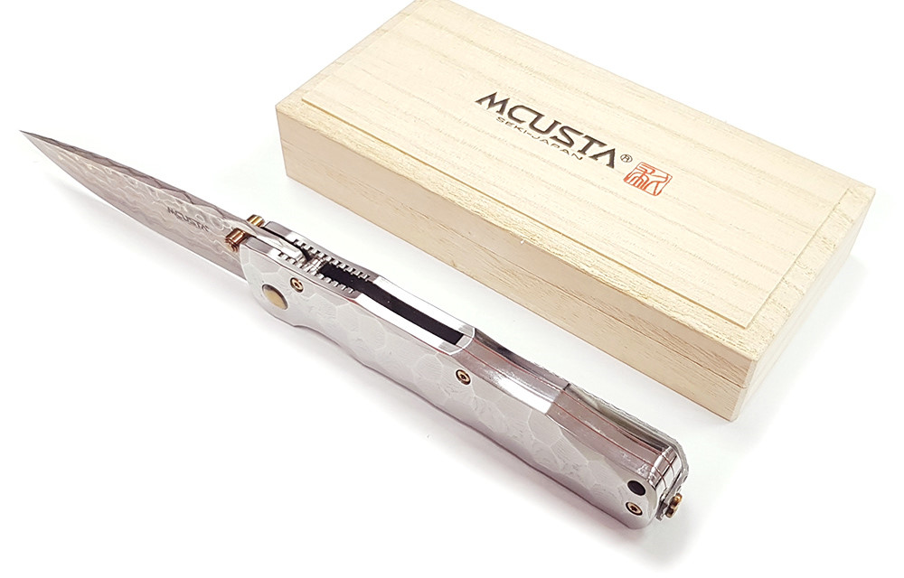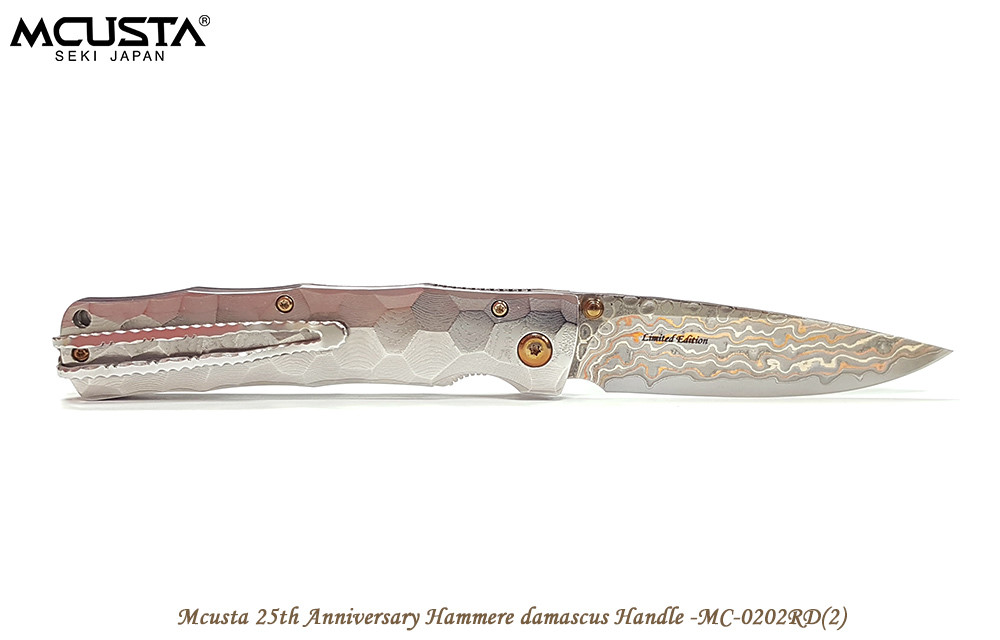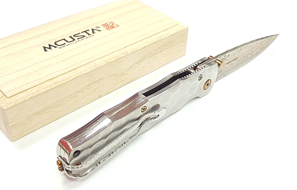 Mcusta 產自日本關市,將現代科技與日本傳統工藝結合,打造手工打造的客製化品質刀具。這款刀具閉合長度4.5 英寸,採用 33 層大馬士革鉬目金不銹鋼刀片,V-Toku 刀芯,搭配實心大馬士革不銹鋼手柄,造型類似竹節,內襯不銹鋼。刀夾可翻轉,方便左手或右手攜帶。限量發行。