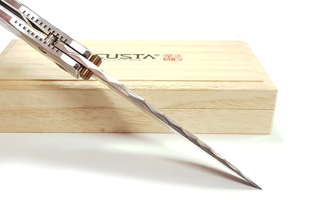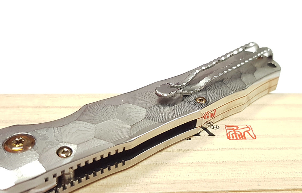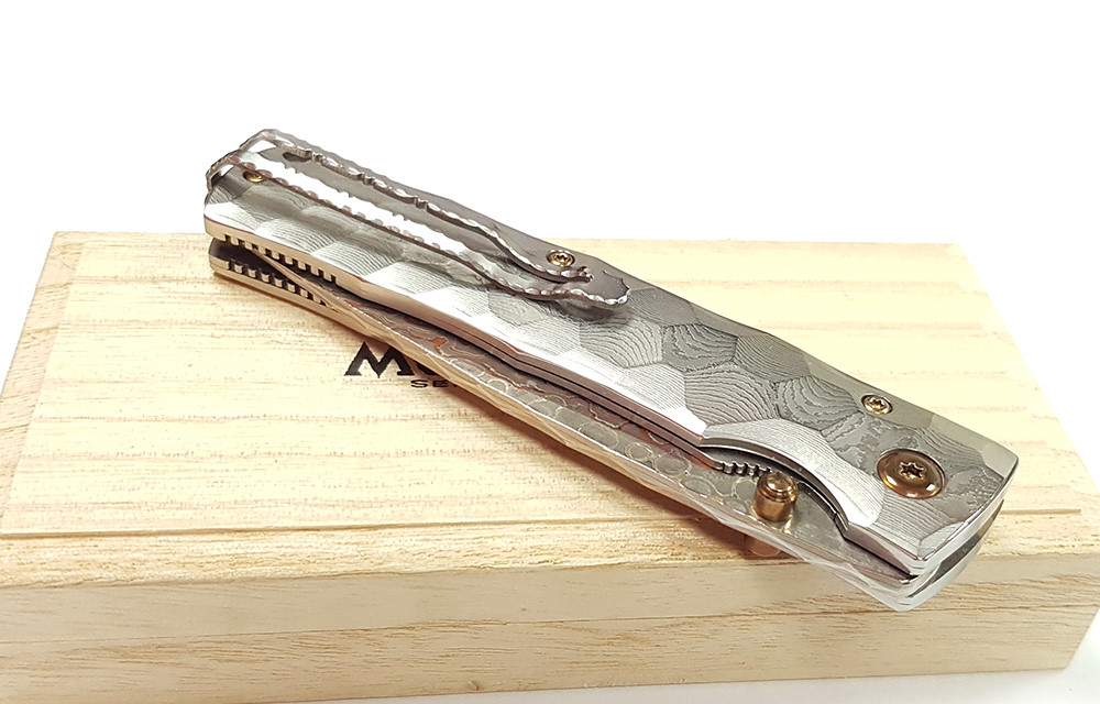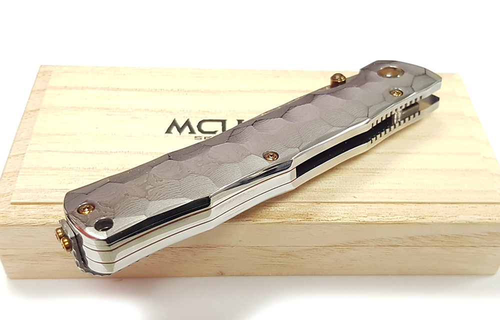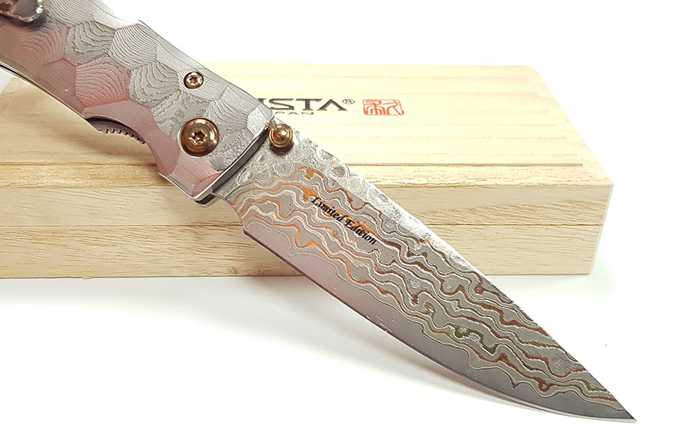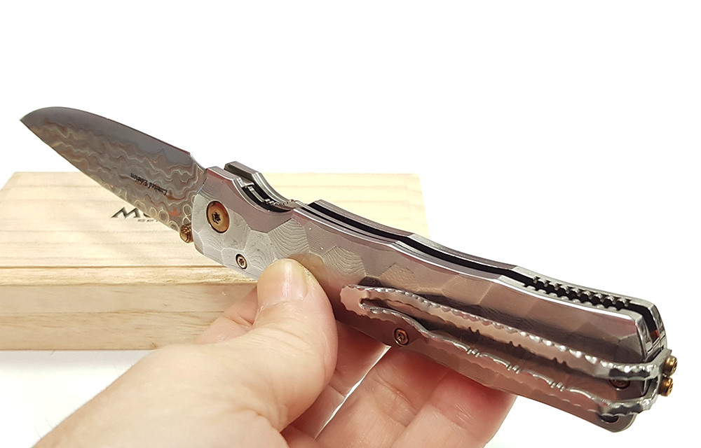 Mcusta 產自日本關市,將現代科技與日本傳統工藝結合,打造手工打造的客製化品質刀具。這款刀具閉合長度4.5 英寸,採用 33 層大馬士革鉬目金不銹鋼刀片,V-Toku 刀芯,搭配實心大馬士革不銹鋼手柄,造型類似竹節,內襯不銹鋼。刀夾可翻轉,方便左手或右手攜帶。限量發行。