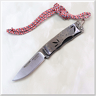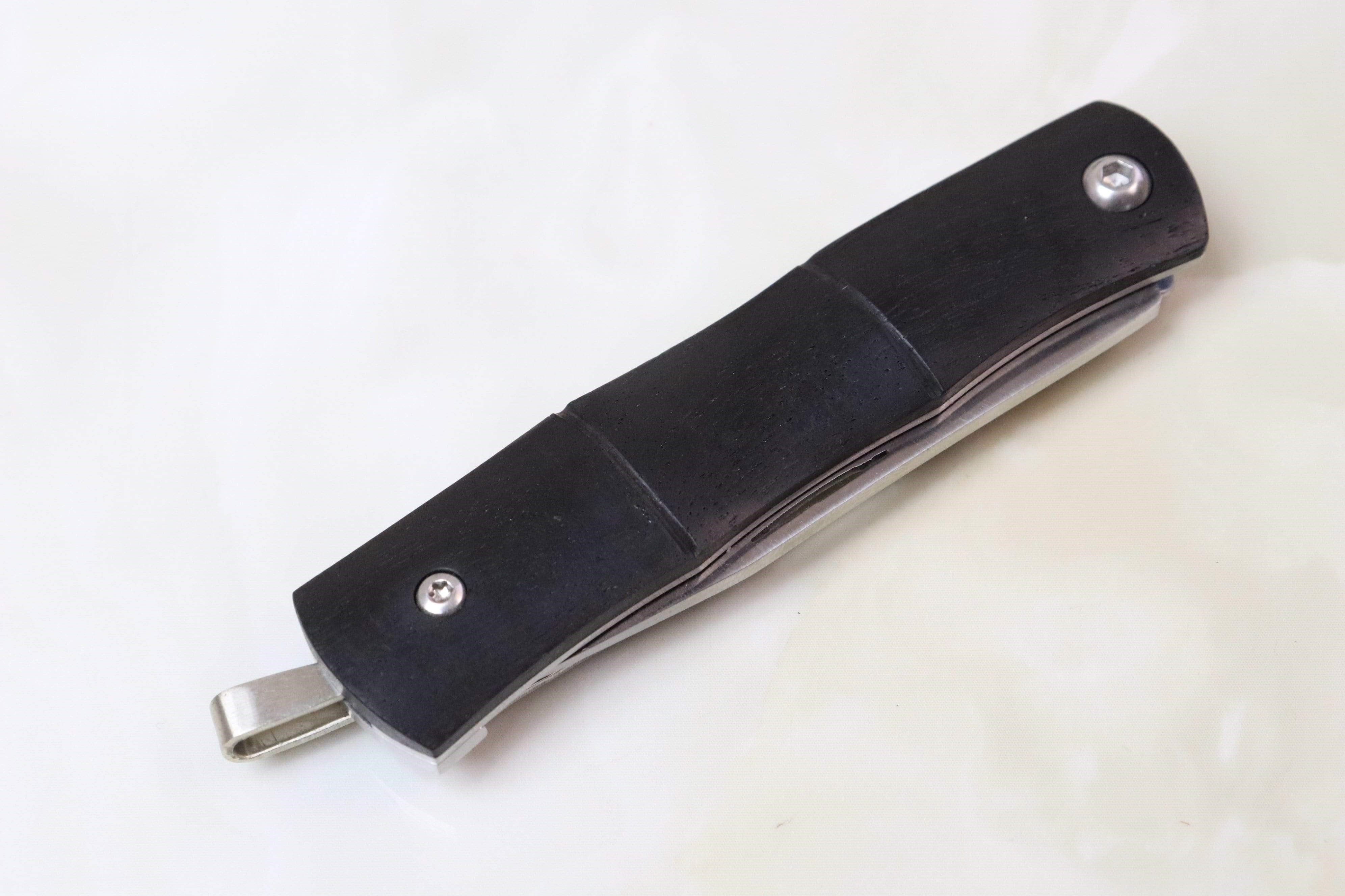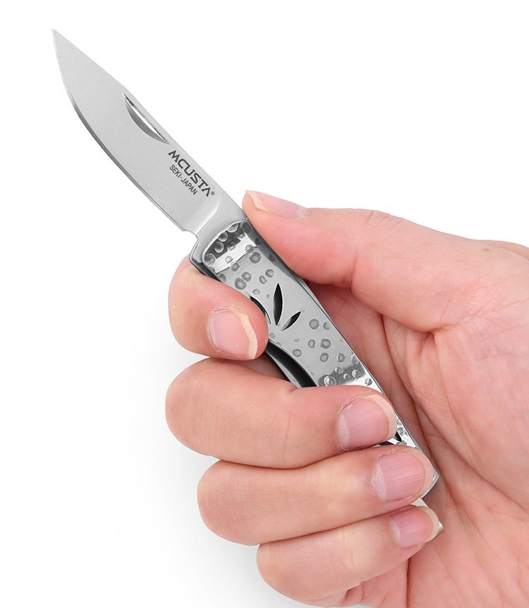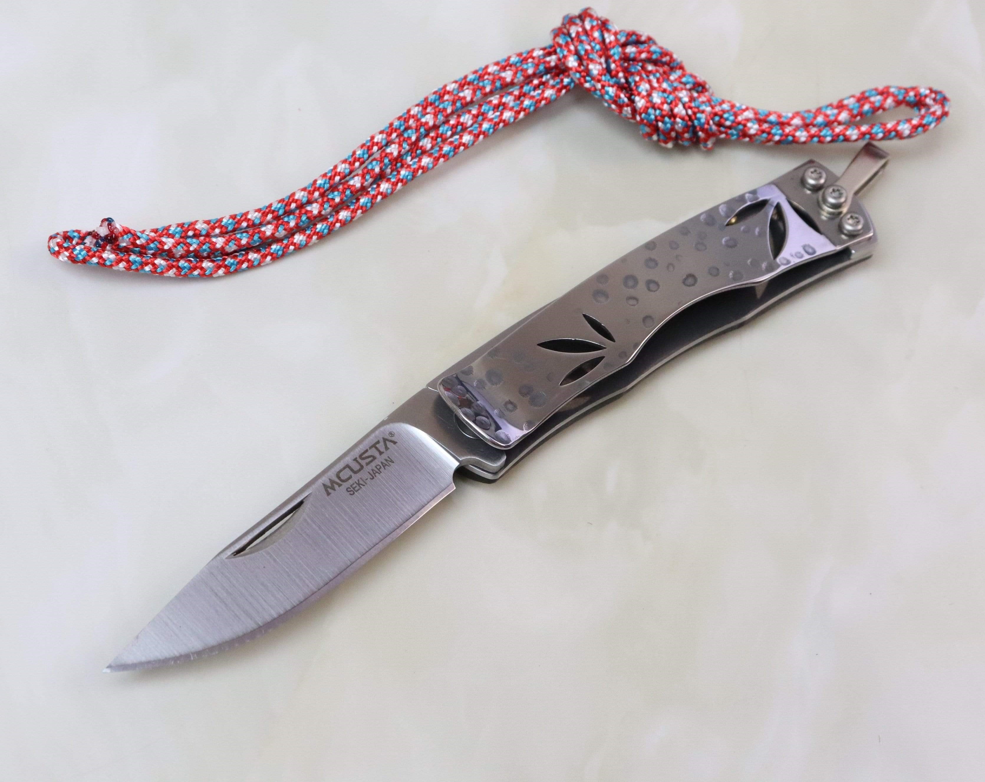 MCUSTA的設計理念,訴求優雅簡單的設計,並且不失耐用。而且更重要的核心概念,便是融合東西方元素,同時結合最新工業技術與日本傳統技藝美學。這款Mcusta折刀握柄背面為大體積的鈔票夾,並以不銹鋼鏡面拋光處理,另一側鑲嵌檀木,刃尾凸環可繫繩索。