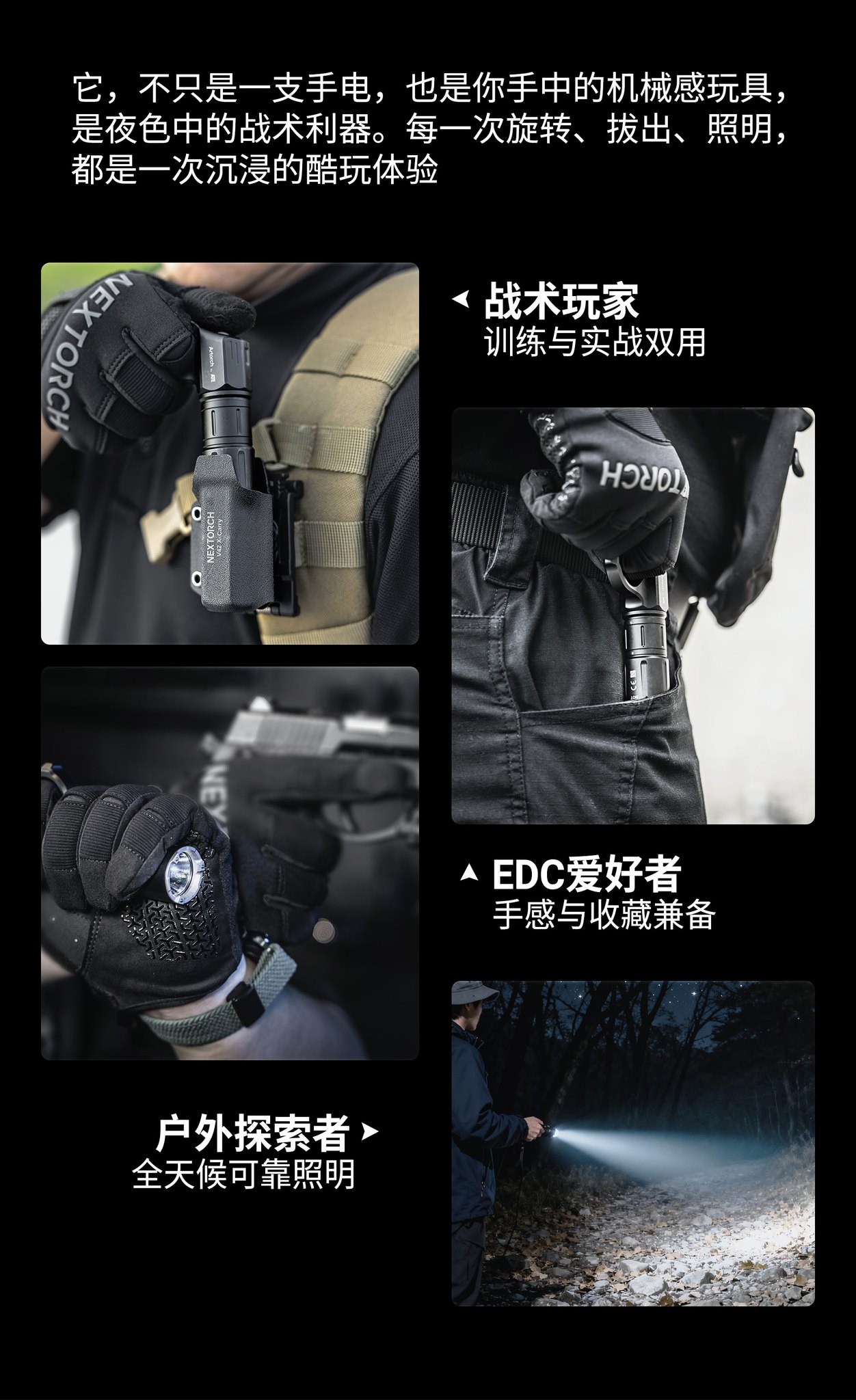 NEXTORCH ARTORCH 戰術隨身電筒專為戶外玩家、戰術愛好者與日常 EDC 而設計。 這款槍型造型的 戰術強光手電筒,兼具 高亮度輸出、輕巧便攜、耐用防水,不論是 露營、登山、警用、家用備用 都能滿足需求。