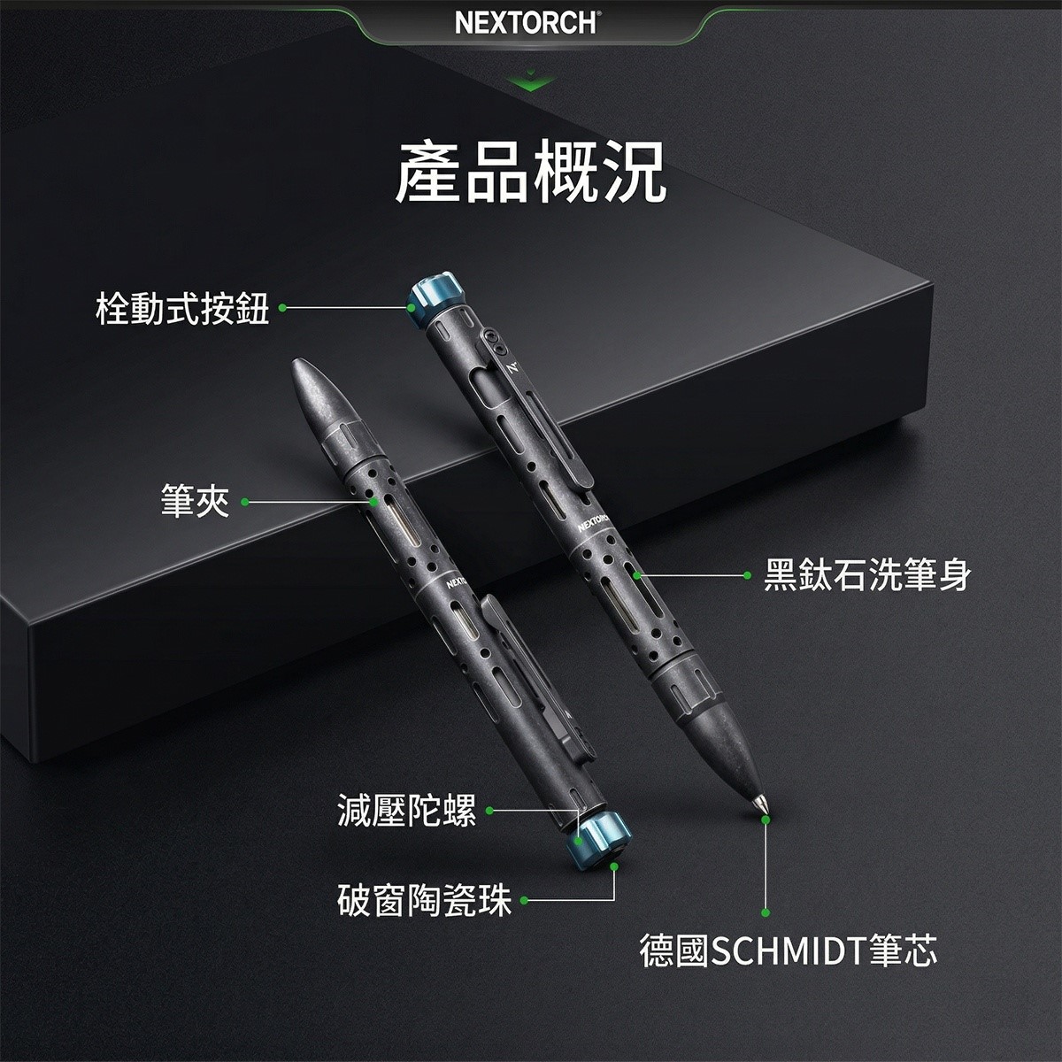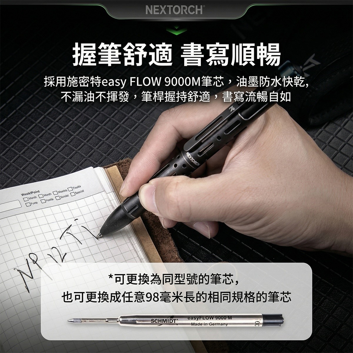NP12 Ti除了具備一般戰術筆常見的日常書寫、安全防衛、應急救援、輕鬆破窗等功能,還增加指尖陀螺設計和槍栓式開關,在防衛屬性、書寫屬性之外又多了把玩樂趣,小小設計為你的日常生活解壓,讓你更加愛不釋手。搭配德國施密特墨水,無論在極端環境下皆可書寫,實用又有趣。