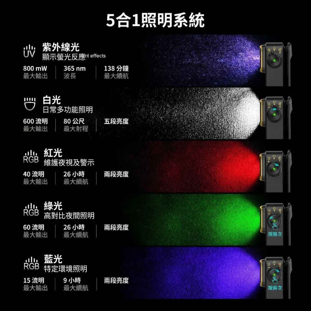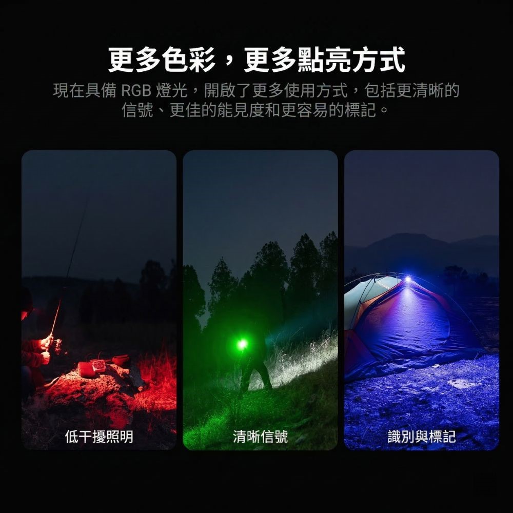●三合一光源設計:具備 500流明泛光、120公尺聚光與夜視紅光。