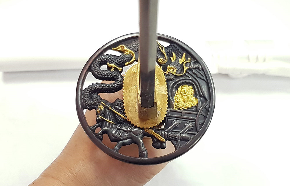 此款武士刀採雙木釘固定,設計簡約,刀刃筆直堅固,弧形線條優美,刀鞘亮漆頗具質感,血槽設計,刀鐔圖騰唯美,居家擺飾或送禮自用練習最佳選擇。