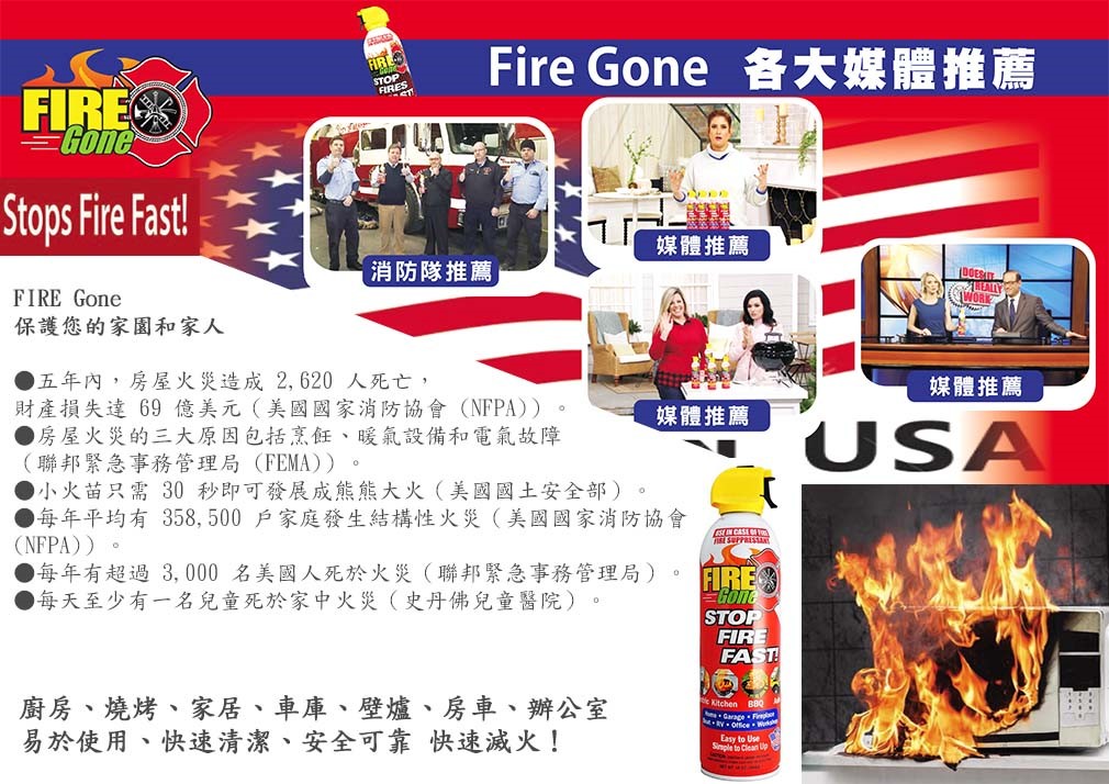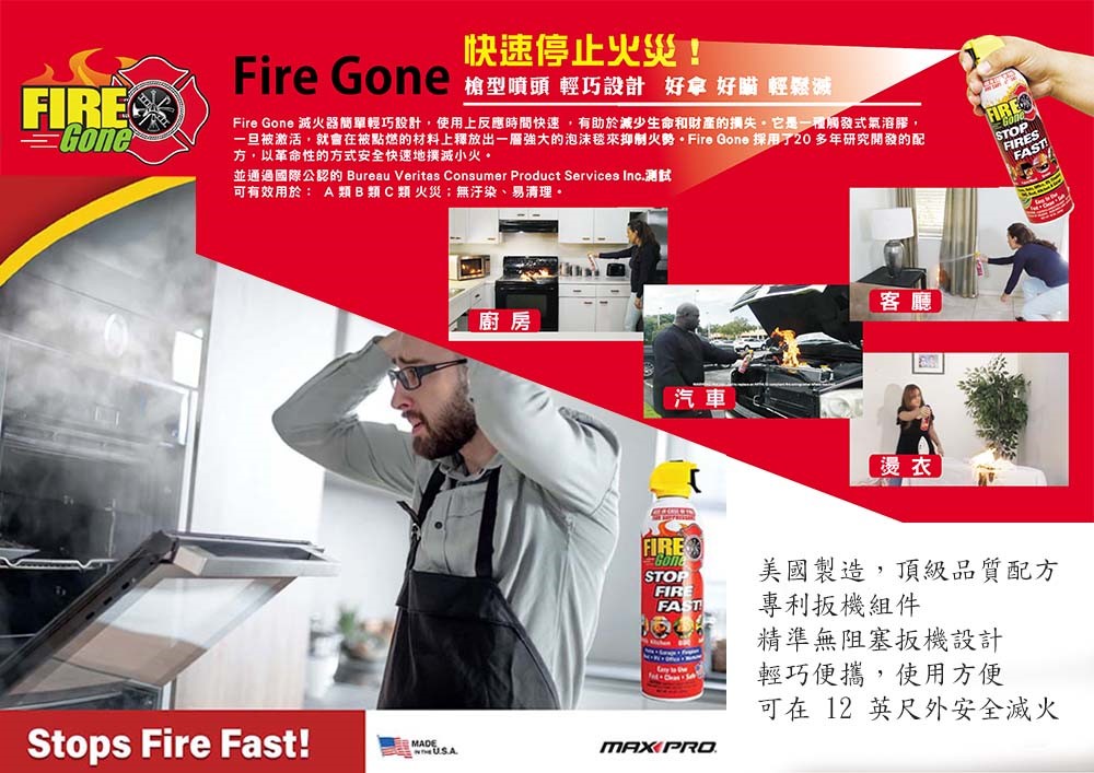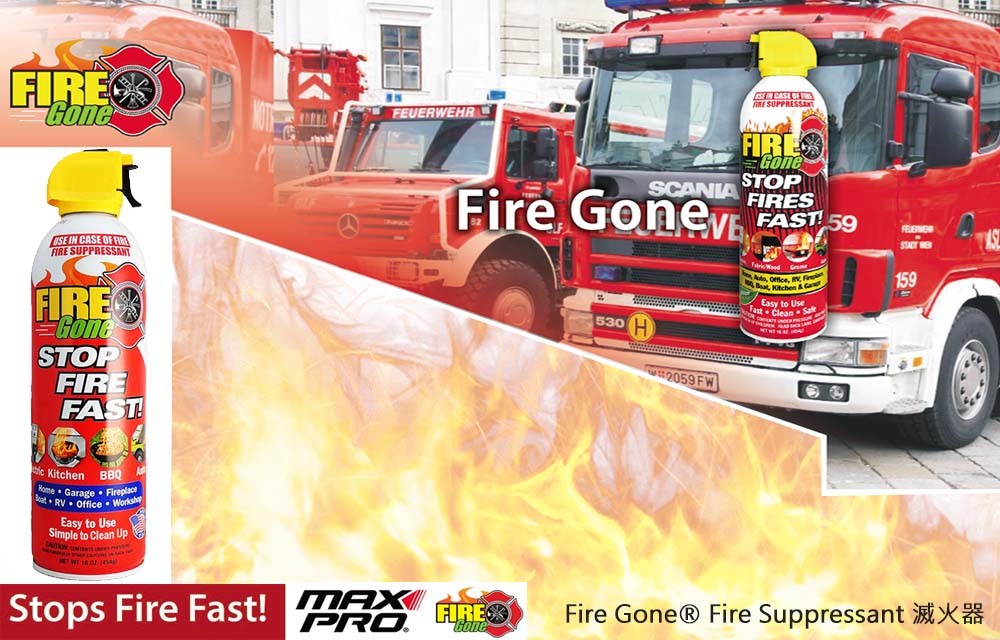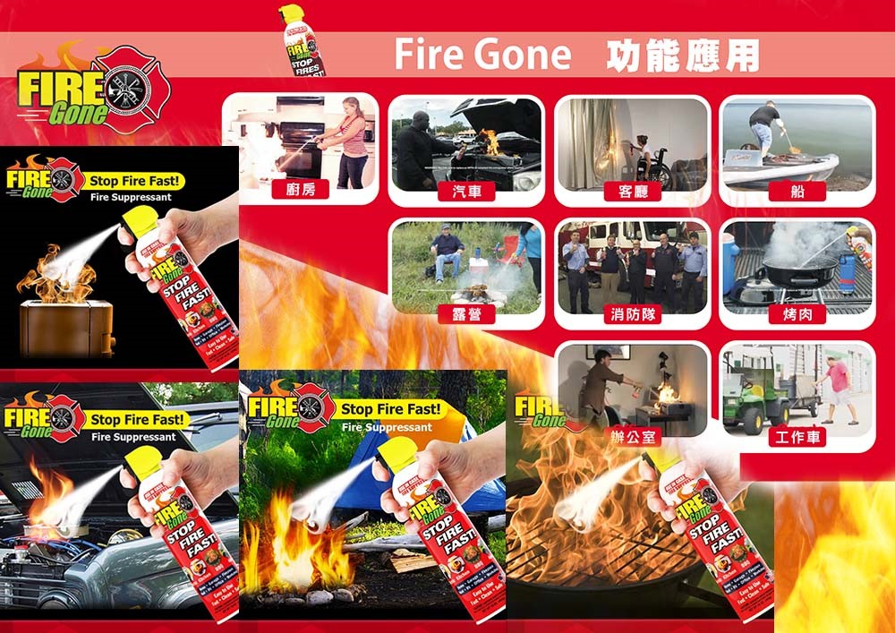 Fire Gone® 是一款採用小巧且設計精巧的氣霧罐包裝的滅火劑。它能夠噴射出強大的定向氣流,直達火源,並在火源表面形成一層特殊配方的滅火泡沫。使用方便,清理也十分便捷。美國專利號:9,375,593