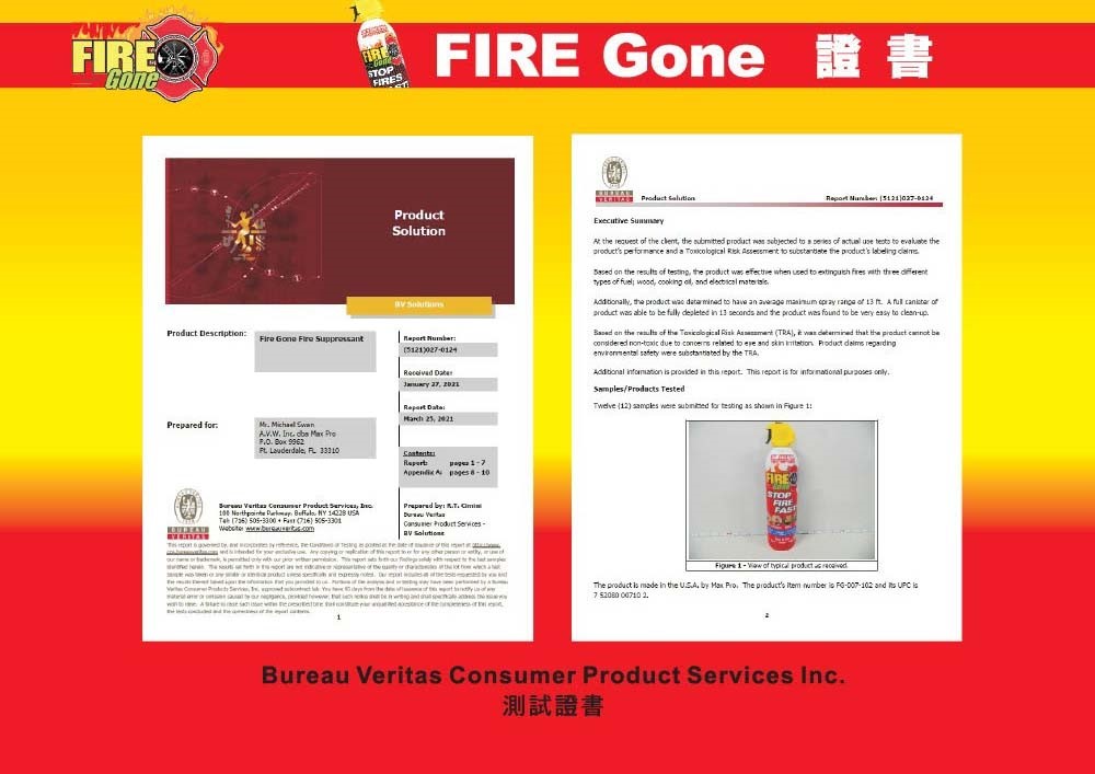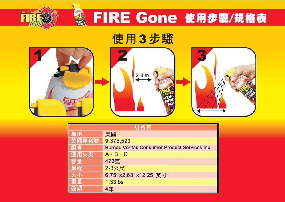 ●Fire Gone通過國際公認的 Bureau Veritas Consumer Product Services Inc. 測試,可有效用於: A 類B 類C 類火災。