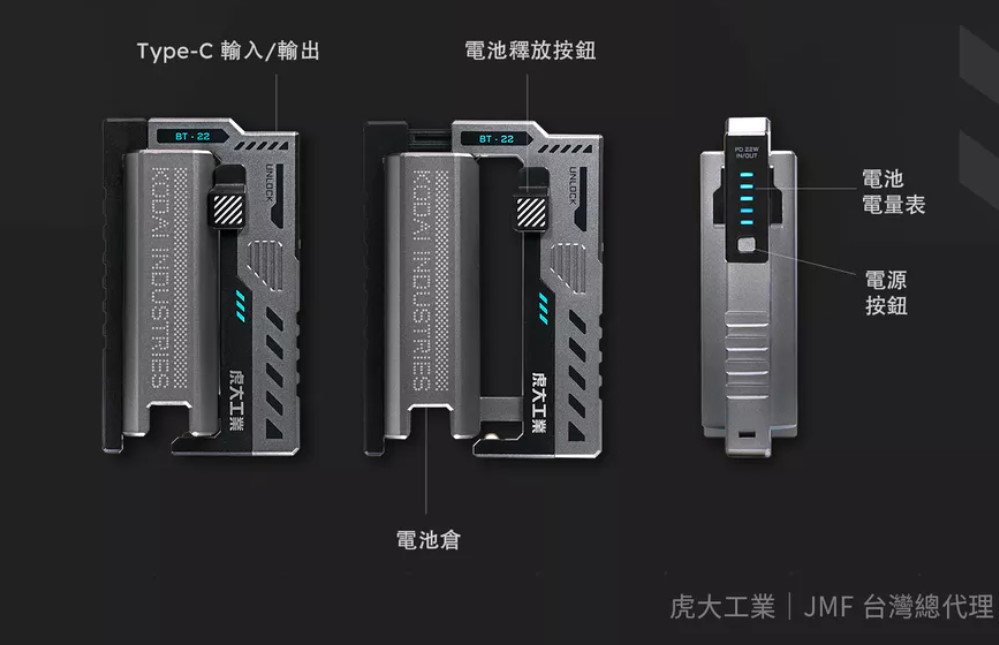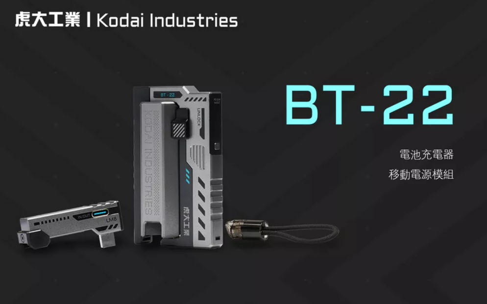 虎大工業(Kodai Industries)推出的 BT-22 Wingman Elite 是一款專為 21700/20700 鋰電池 設計的多功能「換彈式」行動電源與充電器。它延續了前代 BT-20 的機械工業風設計,並在性能與功能上進行了顯著升級。