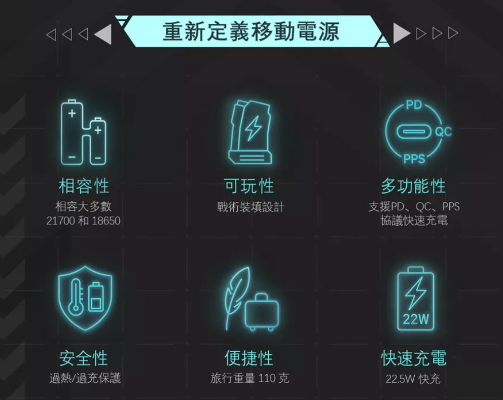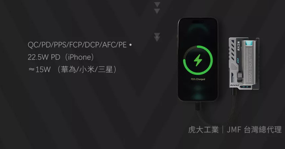 ●輸出功率: 最高 22.5W 快充(支援 PD, QC, PPS, FCP, AFC 等協議)。