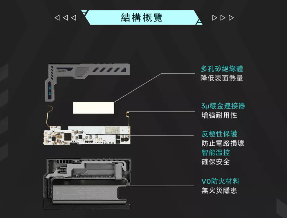 外殼材質: 強化阻燃塑料、3u 鍍金彈片、真空矽隔熱層