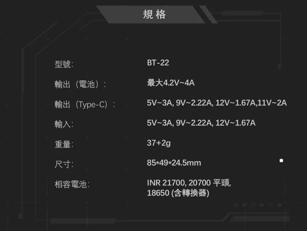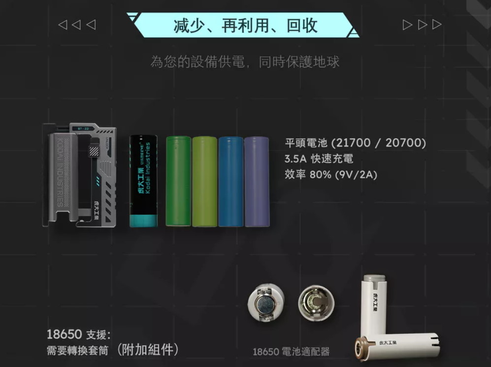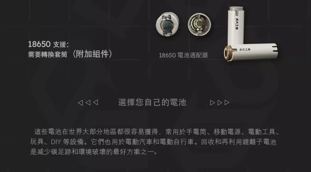 支援 3.6V-3.7V 的 21700、20700 以及 18650(需搭配轉接環)