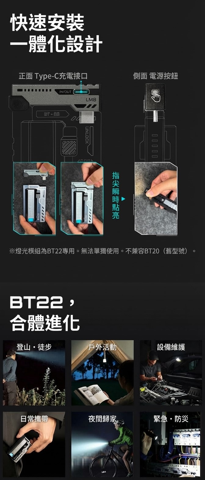 ★LM8 模組: 部分套裝版本包含 LM8 手電筒模組,可直接吸附或安裝在 BT-22 上作為行動照明工具。