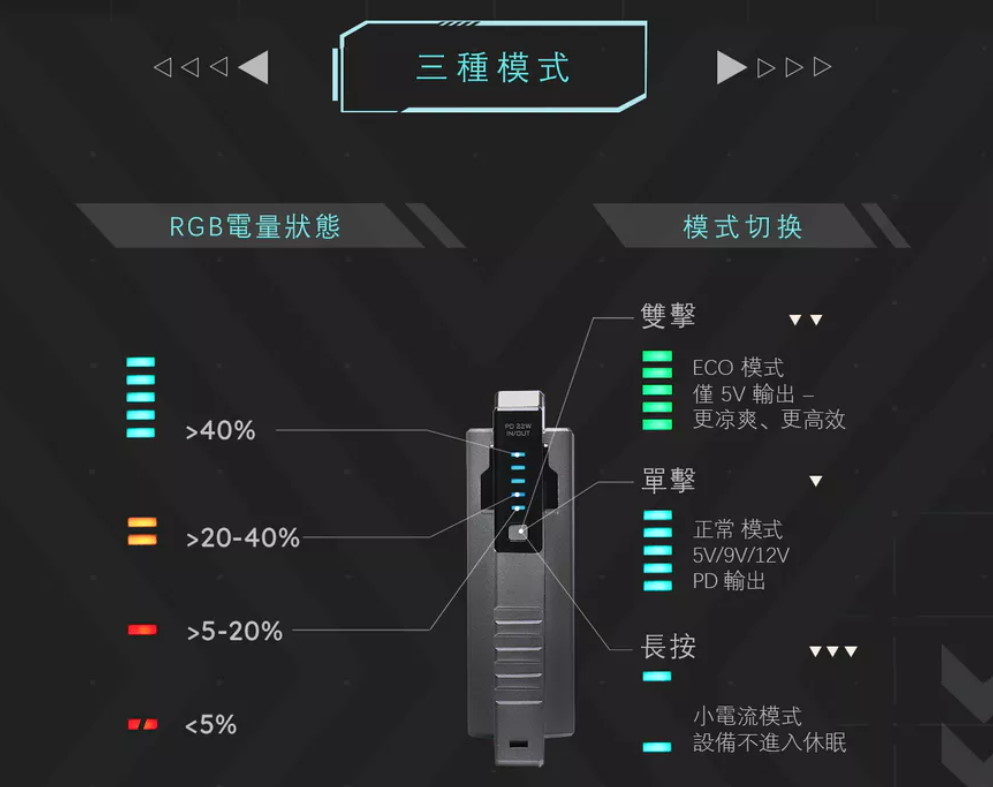 ●與 BT-22 配合: * 重要: 由於手電筒模組耗電較低,使用時建議將 BT-22 切換至 小電流模式(長按電源鍵),以防止行動電源因電流過小自動關機。