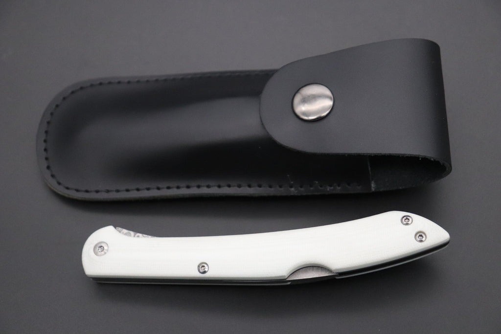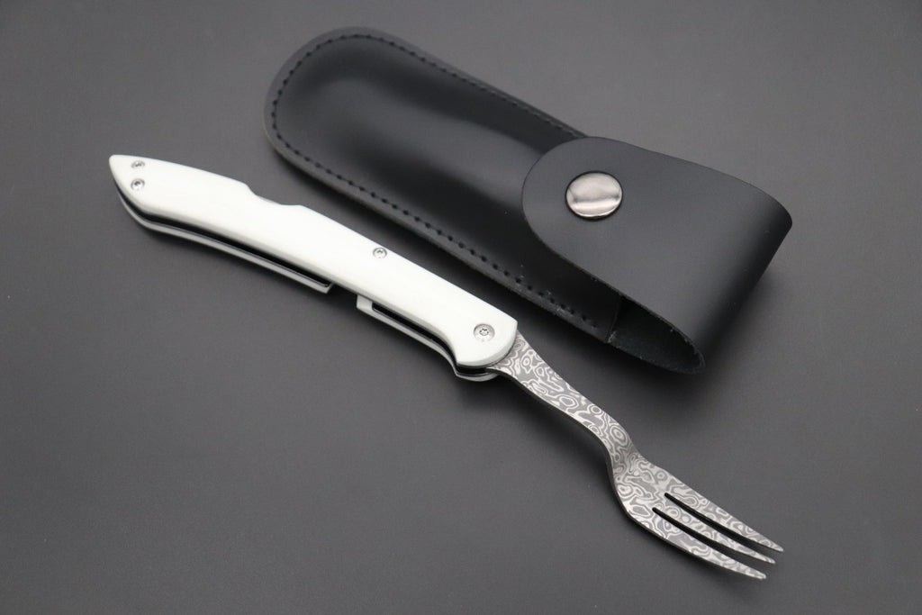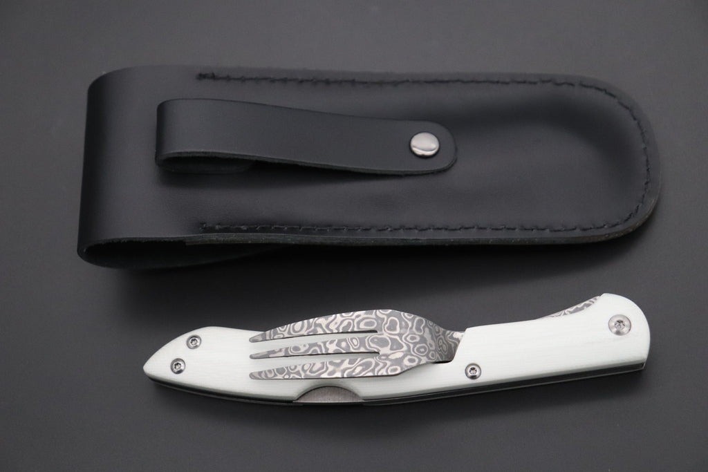 這款精美的Vortex大馬士革折疊叉長3.4吋(87毫米)。 5-1/4英吋(133毫米)長的手柄採用手工打磨的弧形設計,握感舒適,並有白色G-10材質可選。此外,這款折疊叉還附贈優雅的黑色皮革收納袋,方便保護叉子。