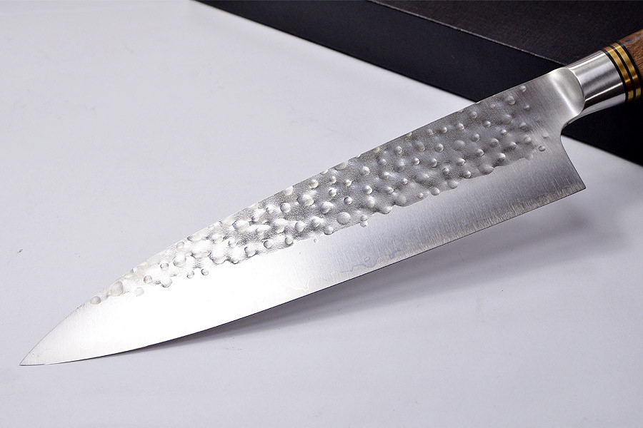 就像原廠的越前內刃(「越前錘鍛刀」)一樣,佐治武士大師的訂製菜刀採用傳統技術錘鍛而成,具有美觀、有力的外觀和具有高洛氏硬度的刀刃。