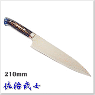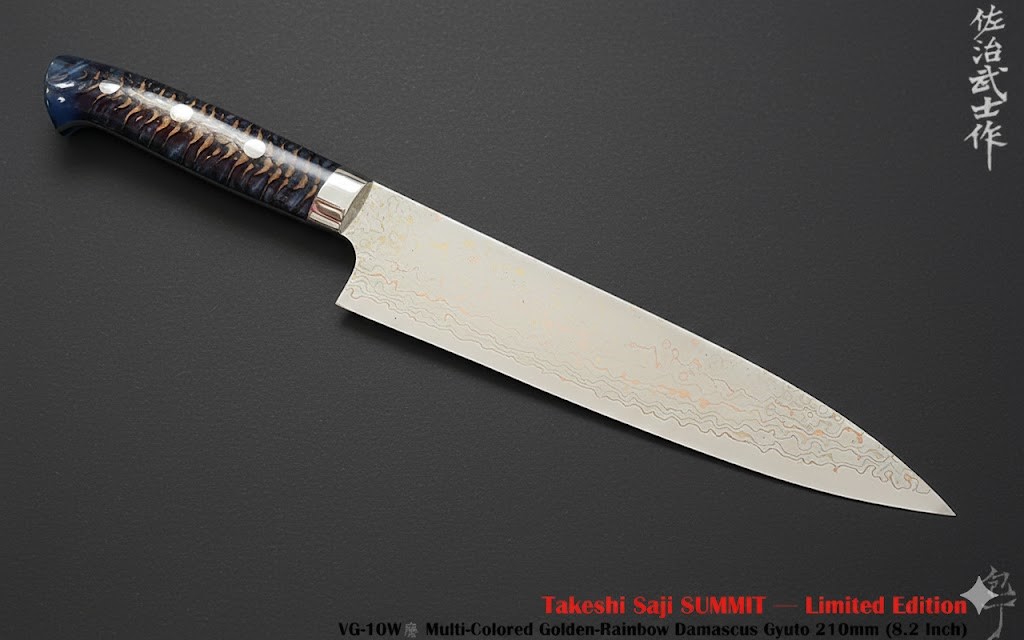 佐治武士 Takeshi Saji SUMMIT - 限量版訂製系列-手工海洋藍色樹脂雲杉果柄彩虹大馬士革鋼牛刀 -VG10W鋼 -210mm