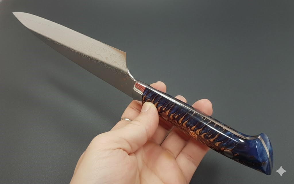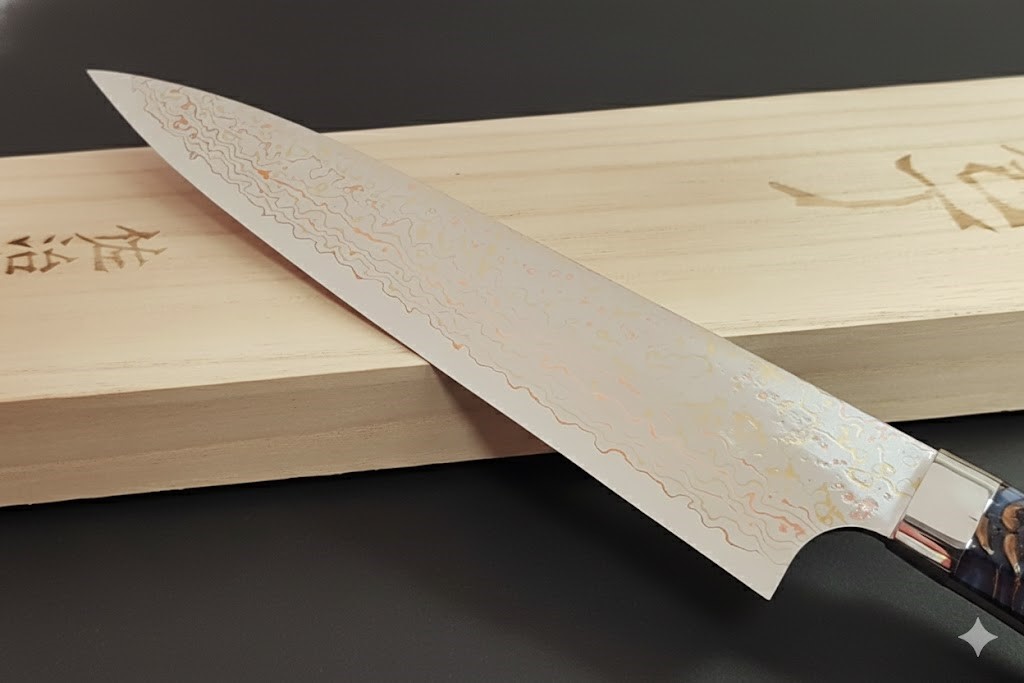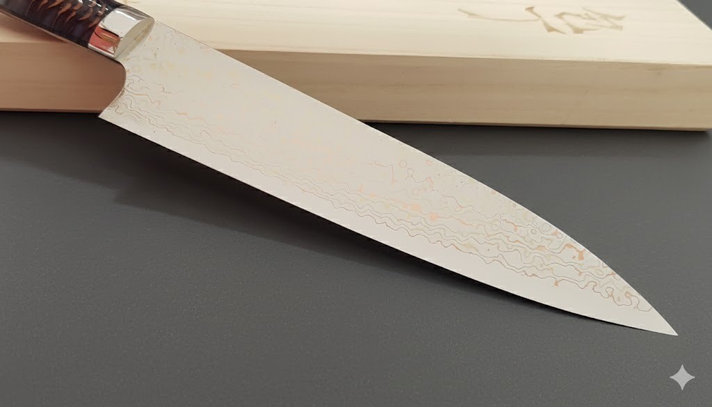 ●刀身核心採用VG-10W鈷鎢不銹鋼(硬度HR.c 61至62),並覆以多層防銹不鏽鋼、黃銅和紫銅。